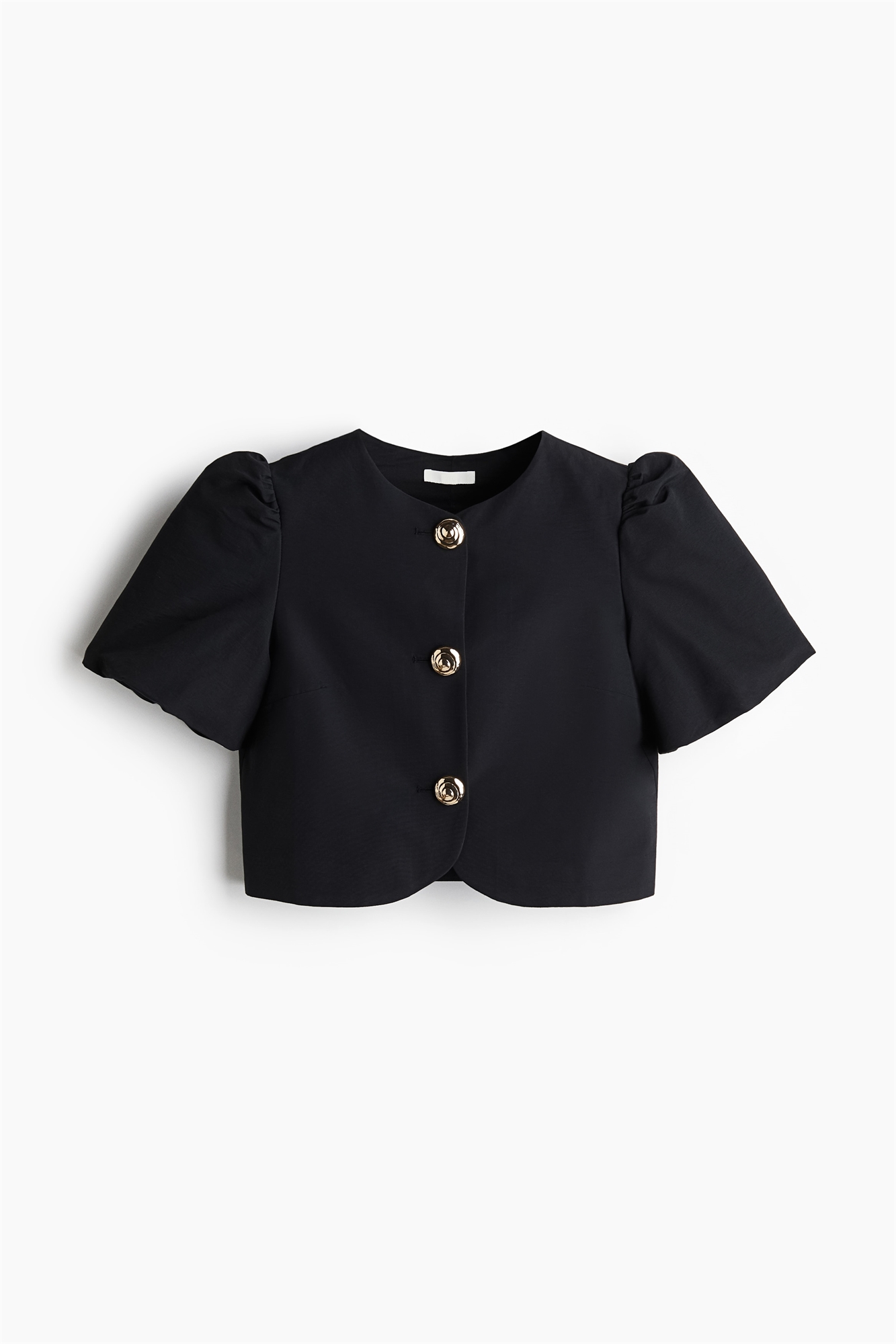 Короткая блузка из тканого материала с круглым вырезом, скульптурными пуговицами спереди и короткими пышными рукавами. На подкладке.