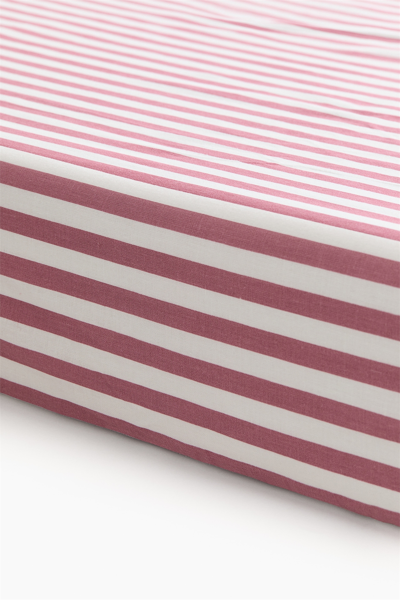 Приталенная простыня для детской кроватки из мягкого хлопкового полотна с принтом в полоску, который легко сочетается с другими цветами и узорами, создавая прекрасное индивидуальное постельное белье.