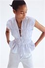 Блузка без рукавов из хлопкового поплина с глубоким V-образным вырезом и двумя рядами завязок-спагетти, которые завязываются спереди. Узкая резинка, которая вместе с завязками создает эффект сборки по всему дизайну. Аккуратный расклешенный пеплум.