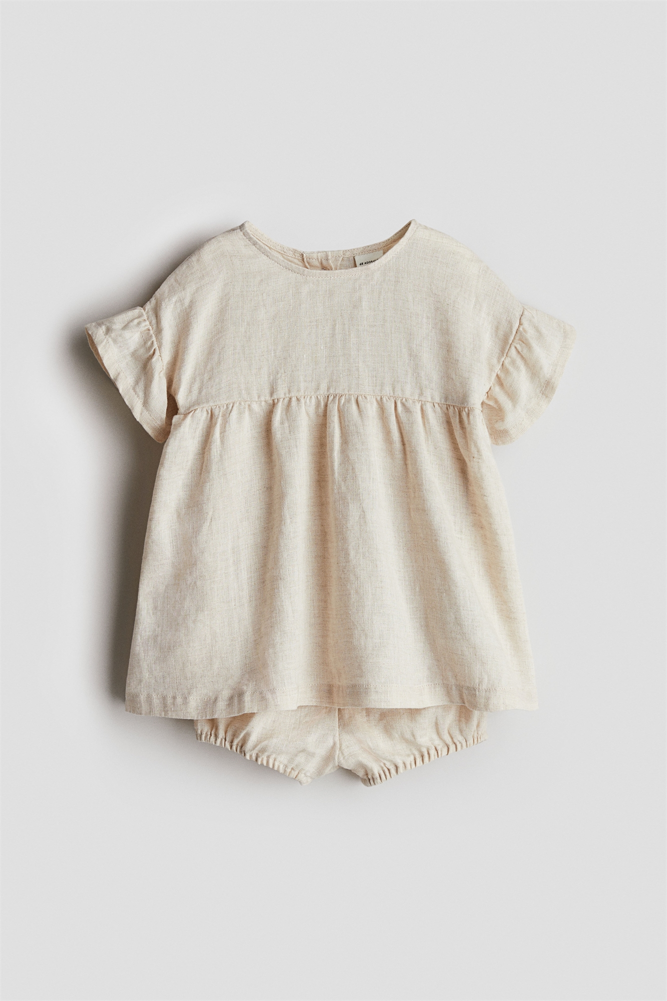H&M Adorables. Комплект из платья и шорты из мягкого, воздушного льна идеально подходит для теплых летних дней. Платье с круглым вырезом, спущенными плечами и рукавами-воланами. Застежка на пуговицы сзади, сборки над талией и расклешенная юбка. Трусы с мягкой эластичной резинкой на талии и вокруг ног. Белье - вечный текстиль с легкой текстурой и быстросохнущими свойствами, который смягчается со временем. Коллекция H&M Adorables - это подборка удобных и качественных вещей, которые не подвластны времени.