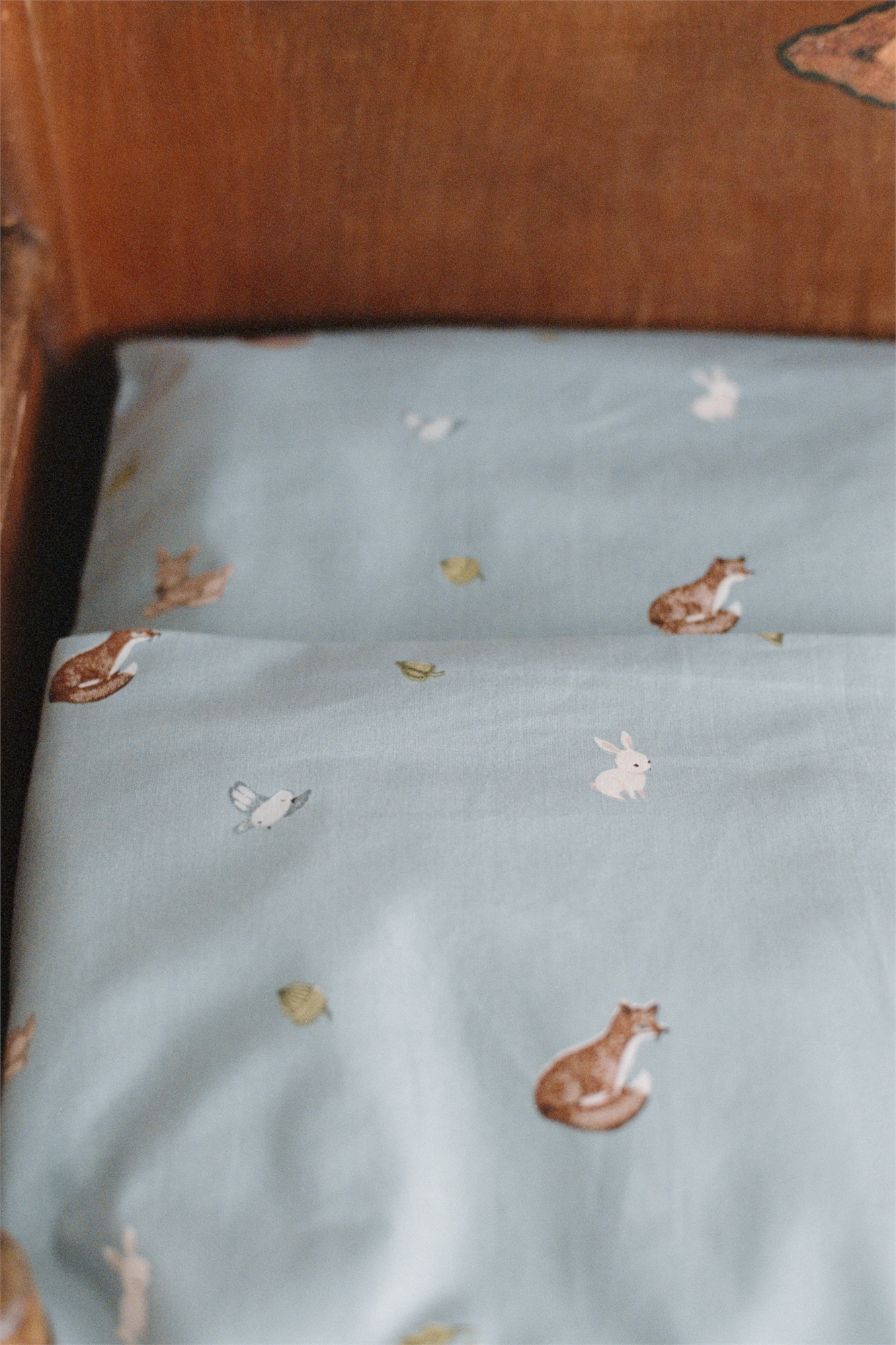 Комплект постельного белья для детской кроватки из хлопкового полотна с принтом. Одна наволочка с отверстием для конверт.