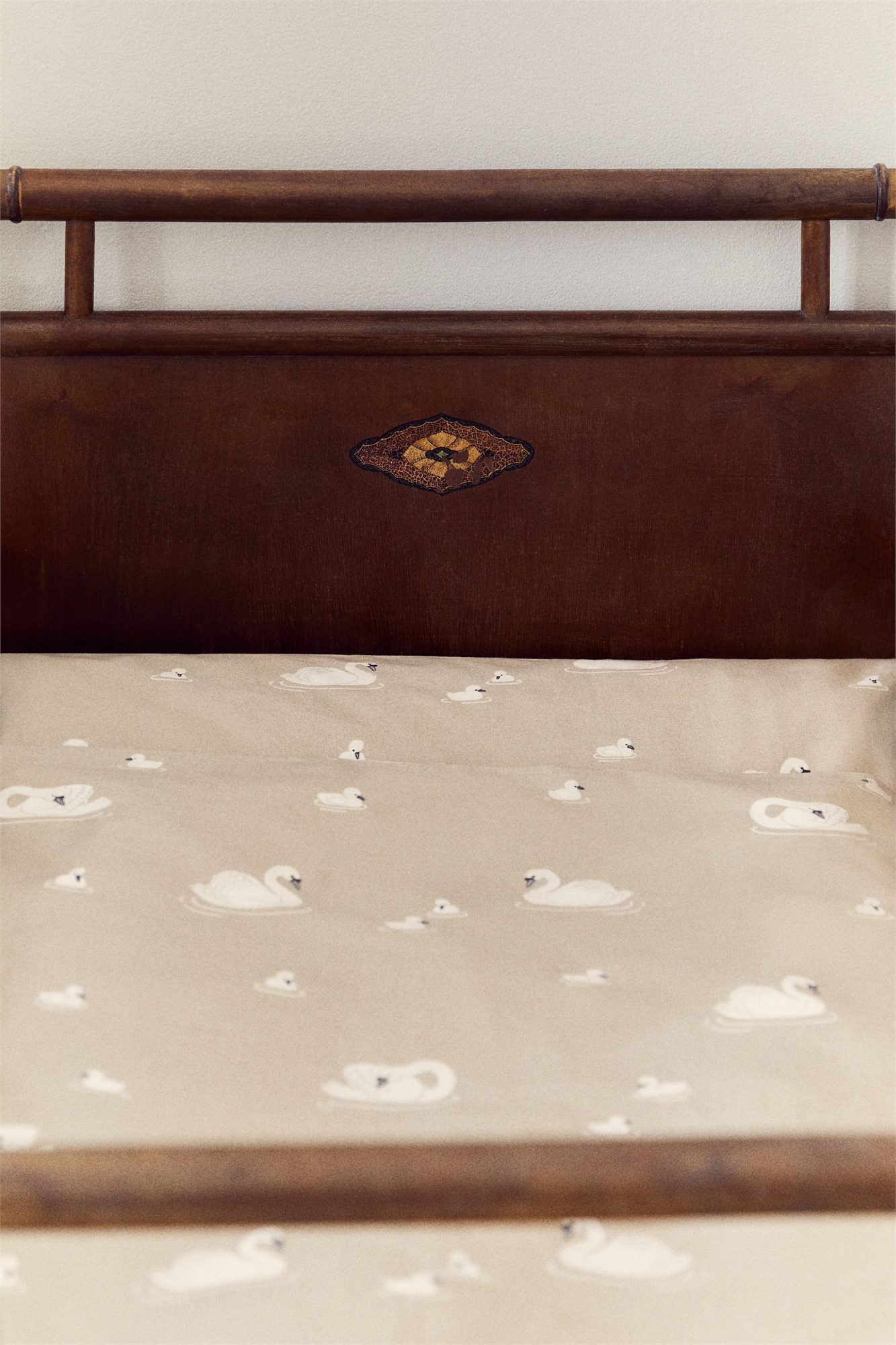 Комплект постельного белья для детской кроватки из хлопка с принтом. Пододеяльник застегивается на потайные кнопки внизу, а наволочка имеет отверстие-конверт.