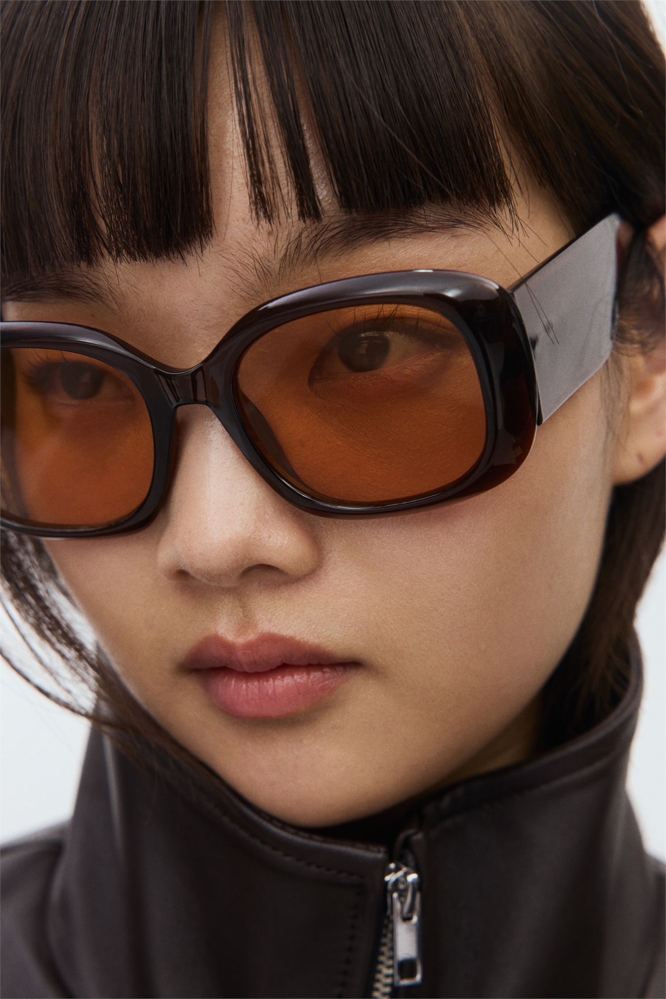 Квадратные солнцезащитные очки с пластиковой оправой и боковыми дужками и тонированными пластиковыми линзами с УФ-защитой.