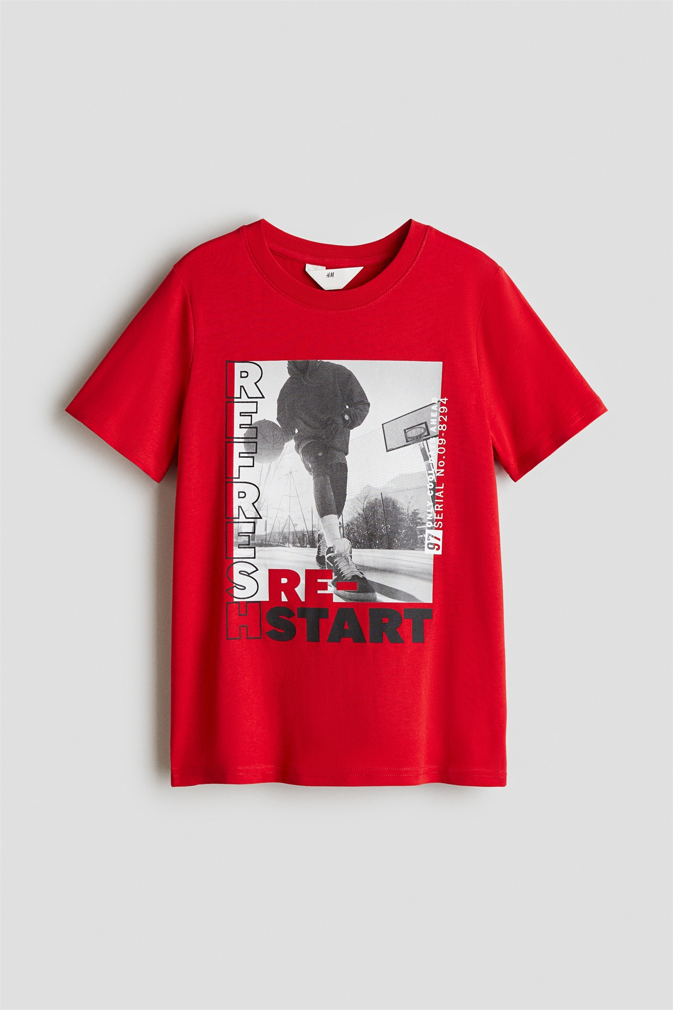 Футболка из хлопкового джерси с принтом, круглым вырезом с ребристой отделкой и прямым покроем.
