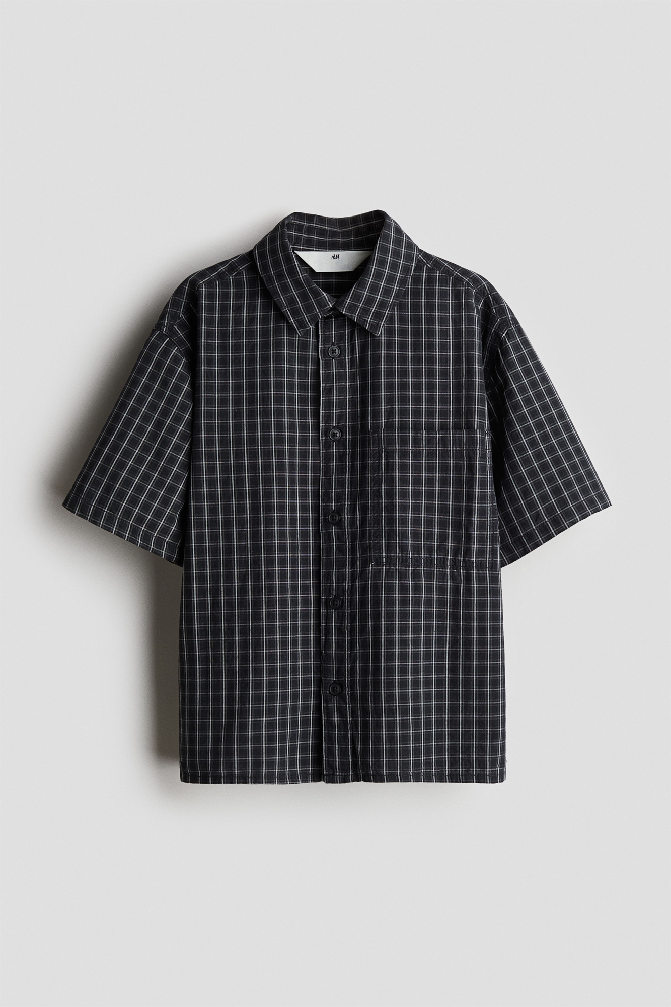 Рубашка с короткими рукавами из мягкого хлопкового полотна с воротником, пуговицами спереди и слегка спущенными плечами. Накладной нагрудный карман и ярмо сзади.