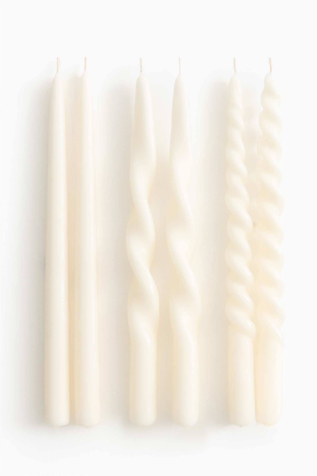 Конические свечи трех разных форм: обычная, свободная спираль и тугая спираль. Время горения 8 часов. Диаметр у основания 2,2 см. Высота 30 см.