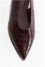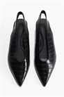 Балетки с заостренным носком и эластичным ремешком на пятке сзади. Атласная подкладка. Каблук 1,5 см.
