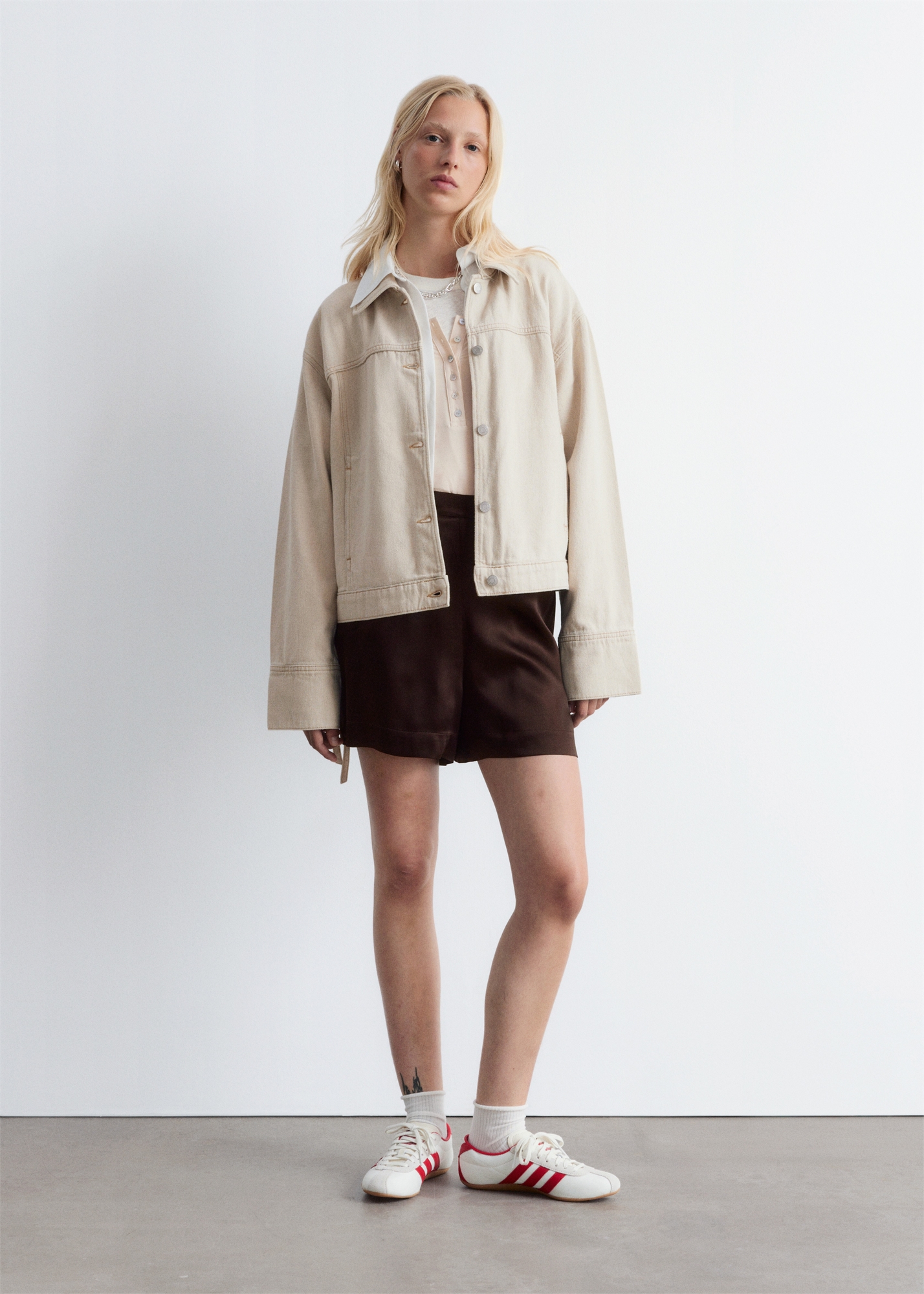 Эта обрезанная джинсовая куртка сшита из смеси хлопка и льна и отличается структурированностью и легкостью. Она имеет прямой силуэт, классический воротник, прошитые швы, потайные карманы и тонкие разрезы в боковом шве, застегивающиеся на завязки. Идеальная куртка для весны и лета. Длина куртки: 55,7 см / 21,9" (размер S)