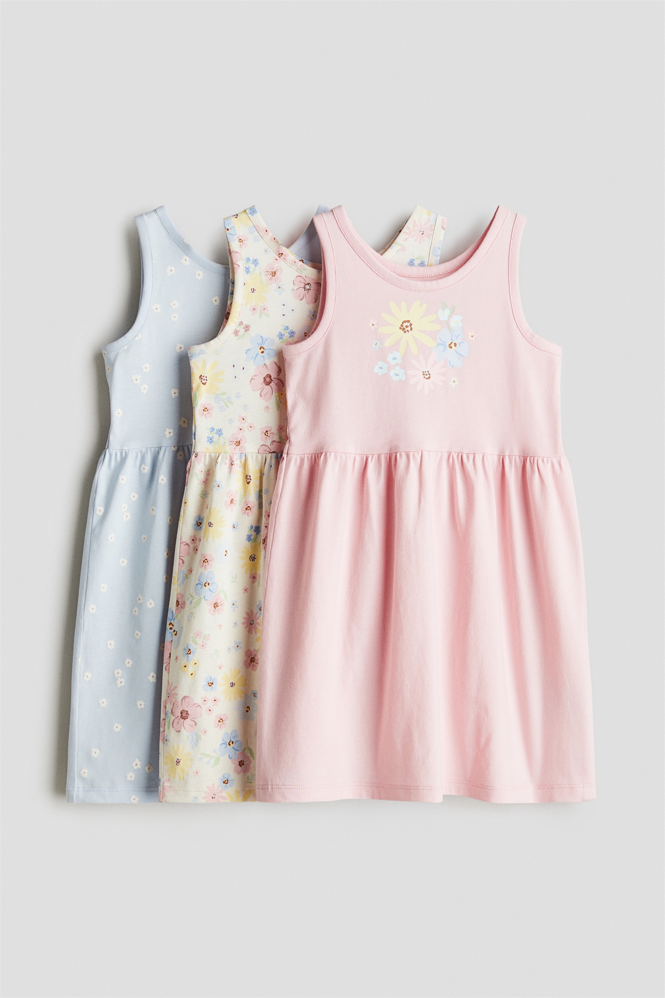 Платья без рукавов из мягкого хлопкового джерси с набивным рисунком. Круглый вырез, сборки на талии и слегка расклешенная юбка.