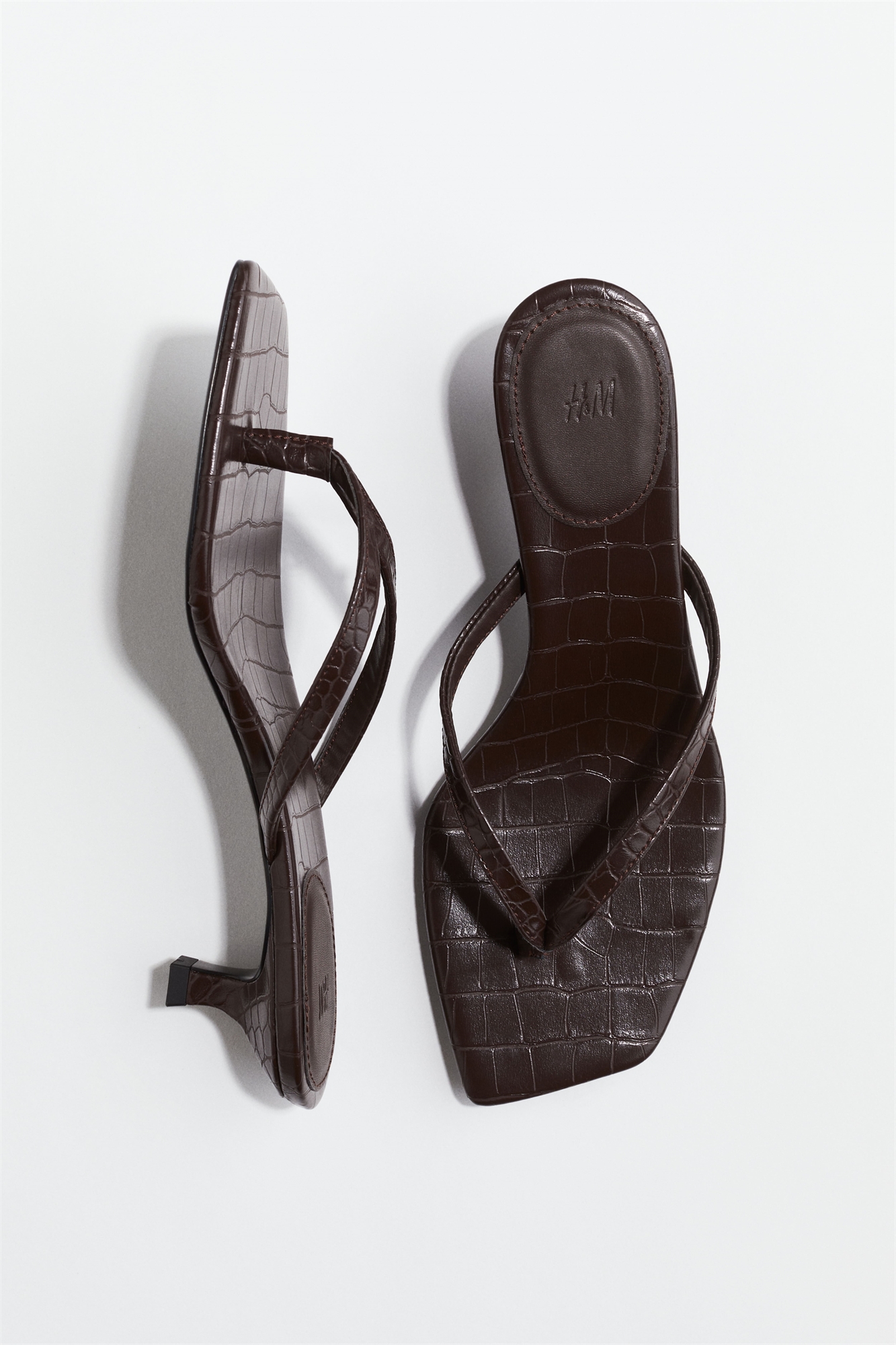 Сандалии из лакированной ткани с угловатыми носками, узким ремешком и мыском, а также каблуком-рюмочкой.