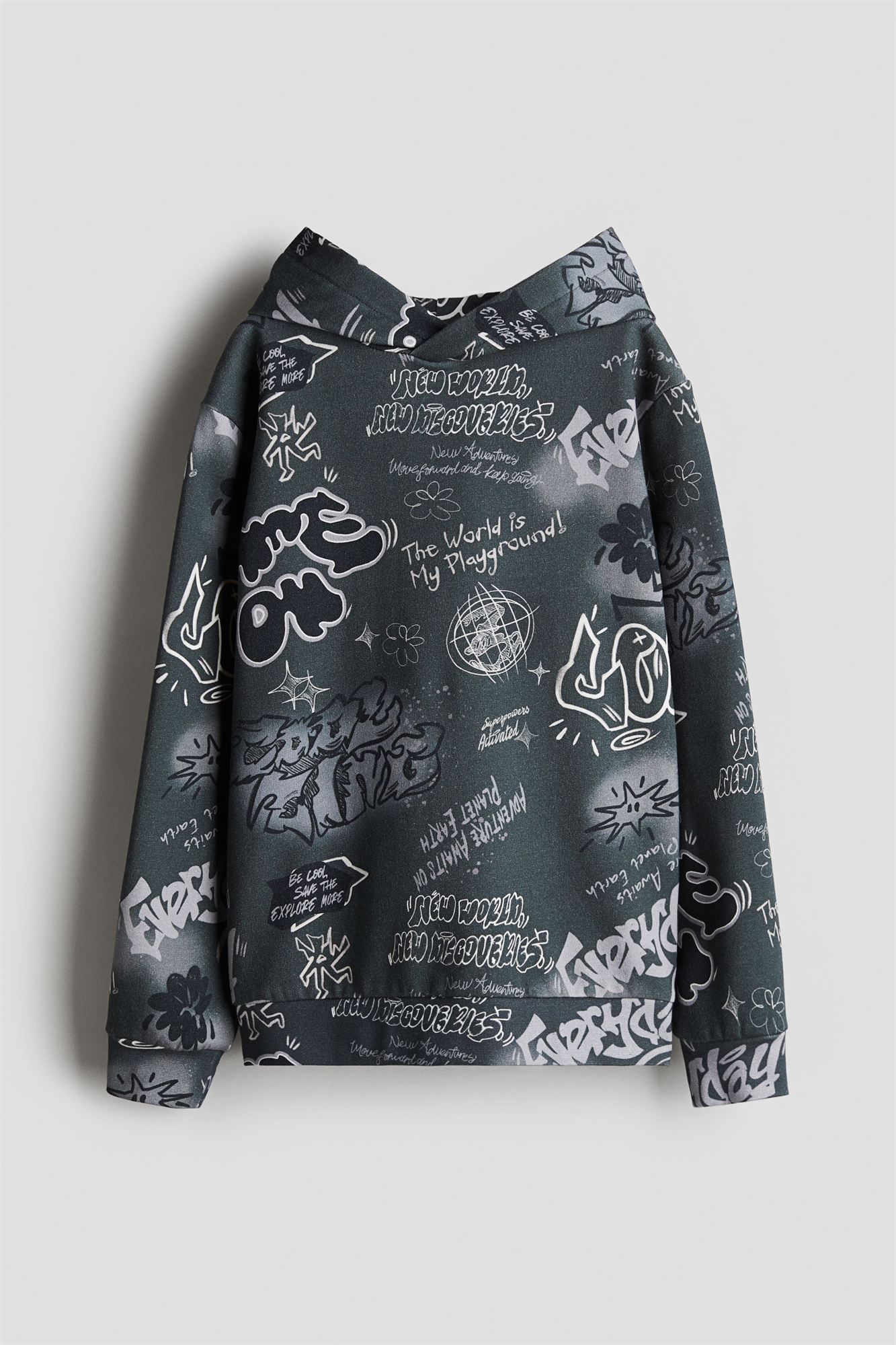 Толстовка из принтованной ткани с мягким начесом внутри. Капюшон с подкладкой из джерси, накидка спереди, спущенные плечи и длинные рукава. Манжеты и подол в рубчик.