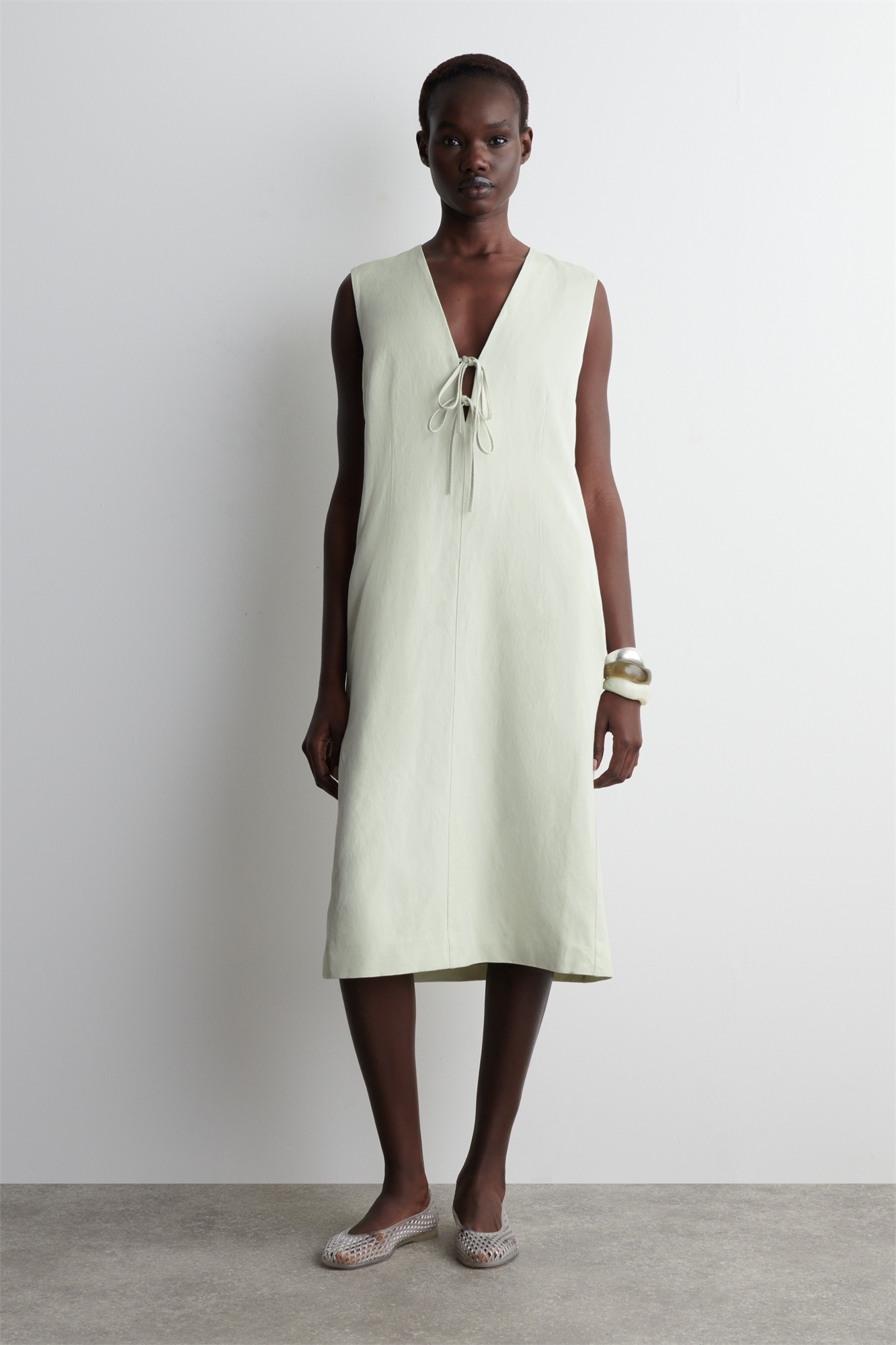 Это платье-миди с V-образным вырезом, деликатными завязками спереди и вытачками на талии, которые придают силуэту мягкость классического пошива. Оно создано из ECOVERO™ вискозы, льна и хлопка для легкости и воздухопроницаемости, а вентиляционное отверстие сзади обеспечивает свободу движений. Regular fitLENZING™ ECOVERO™ вискоза - это фирменное вискозное волокно, изготовленное из древесной массы Оболочка: 61% ECOVERO™ вискоза, 28% лен, 11% хлопок. Подкладка: 100% хлопок. Без учета отделки / Машинная стирка Длина по спинке для размера EU 36 составляет 107,9 см / Модель носит размер EU 36