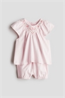 Комплект из блузки и трусиков-распашонок с воздушным переплетением из смеси льна и вискозы. Блузка с круглым вырезом, собранным V-образным ярмом с вышитыми цветочными мотивами спереди, застежкой на пуговицы сзади и рукавами-воланами. Трусы с закрытой, регулируемой резинкой на талии и узкой резинкой по ногам.