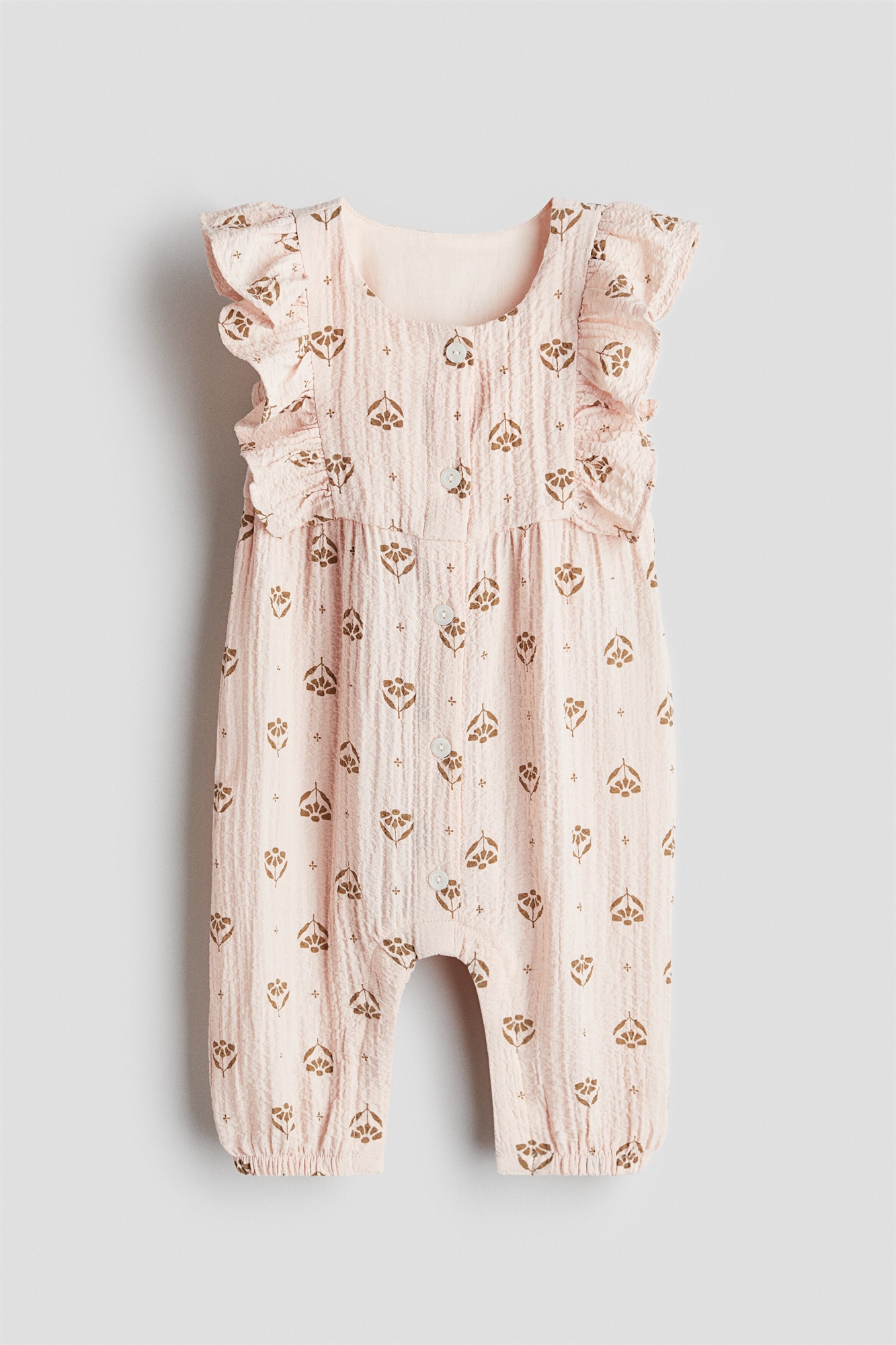 Ромпер без рукавов из мягкого хлопкового муслина с декоративными оборками спереди, переходящими на плечи. Круглый вырез, пуговицы спереди и потайные кнопки на ножках для удобства переодевания (кроме размеров 1½-4Y). Узкая, закрытая резинка на подоле.