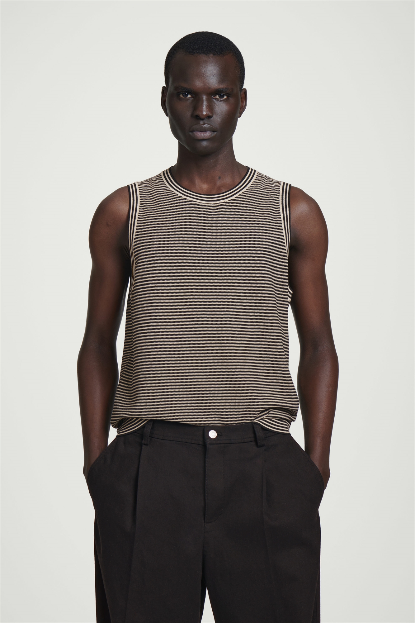 Расслабленная, но изысканная майка - фирменный знак современной мужской одежды. Она связана из мягкого, приятного на ощупь хлопка в полоску и имеет классическую горловину, широкие проймы и ребристый подол. Свободный крой Материал: 100% хлопок. Без учета отделки / Машинная стирка Длина по спинке для размера M составляет 65 см / Модель носит размер M