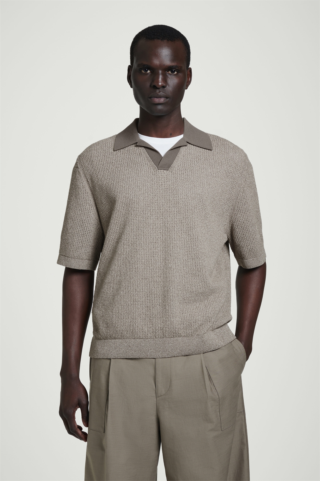 Классическая рубашка-поло переосмыслена благодаря непринужденным формам и богатой текстуре. Эта современная модель связана спицами из тактильного хлопкового бленда bouclé, имеет короткие рукава и непринужденный открытый воротник. Relaxed fitRecycled polyester is polyester made from PET bottles or end-of-life textile waste. ПЭТ-бутылки или текстильные отходы подвергаются механической переработке и перерабатываются в новую пряжу Оболочка: 72% переработанного полиэстера, 28% хлопка. Воротник: 55% хлопка, 45% вискозы. Без учета отделки / Машинная стирка Длина по спинке для размера M составляет 65,5 см / Модель носит размер M