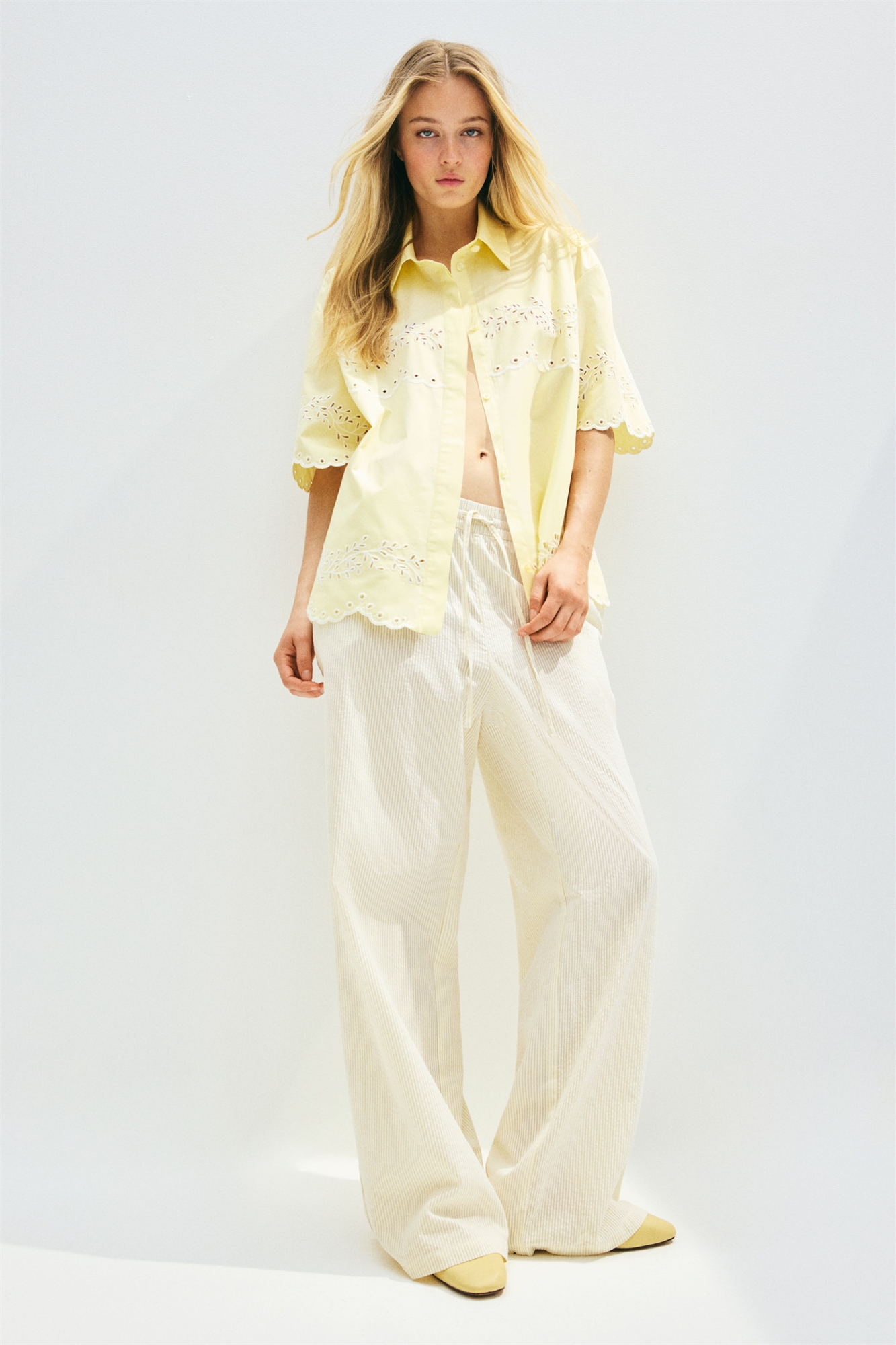 Брюки из хлопкового ситцевого полотна с эластичным швом и утягивающим шнурком на талии. Боковые карманы и широкие штанины.