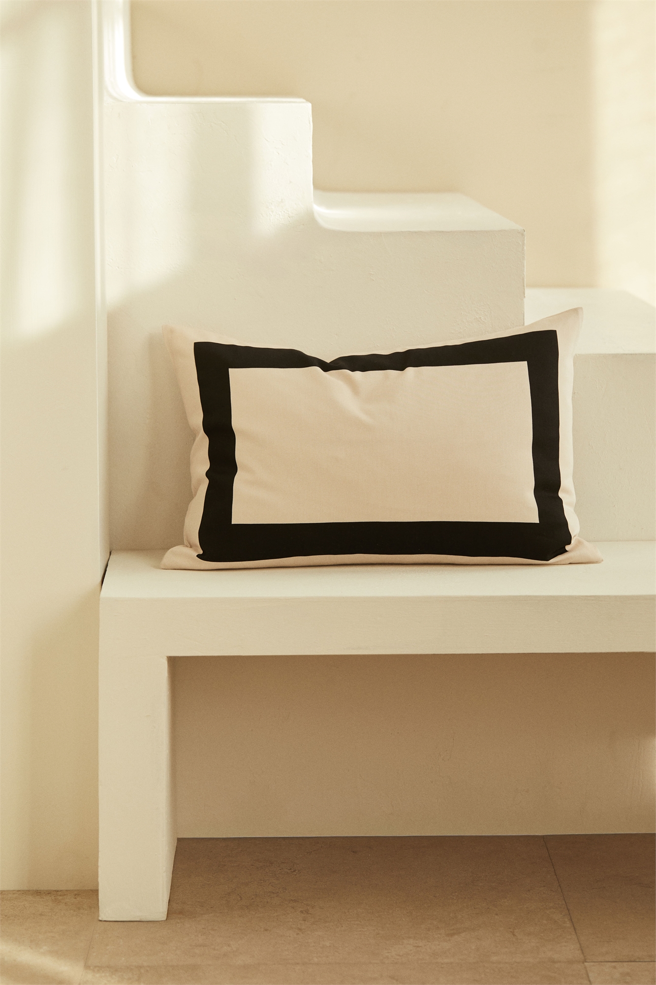 Элегантный чехол для подушки из хлопкового сатина с набивной каймой спереди и сзади. Потайная застежка-молния с одной стороны.