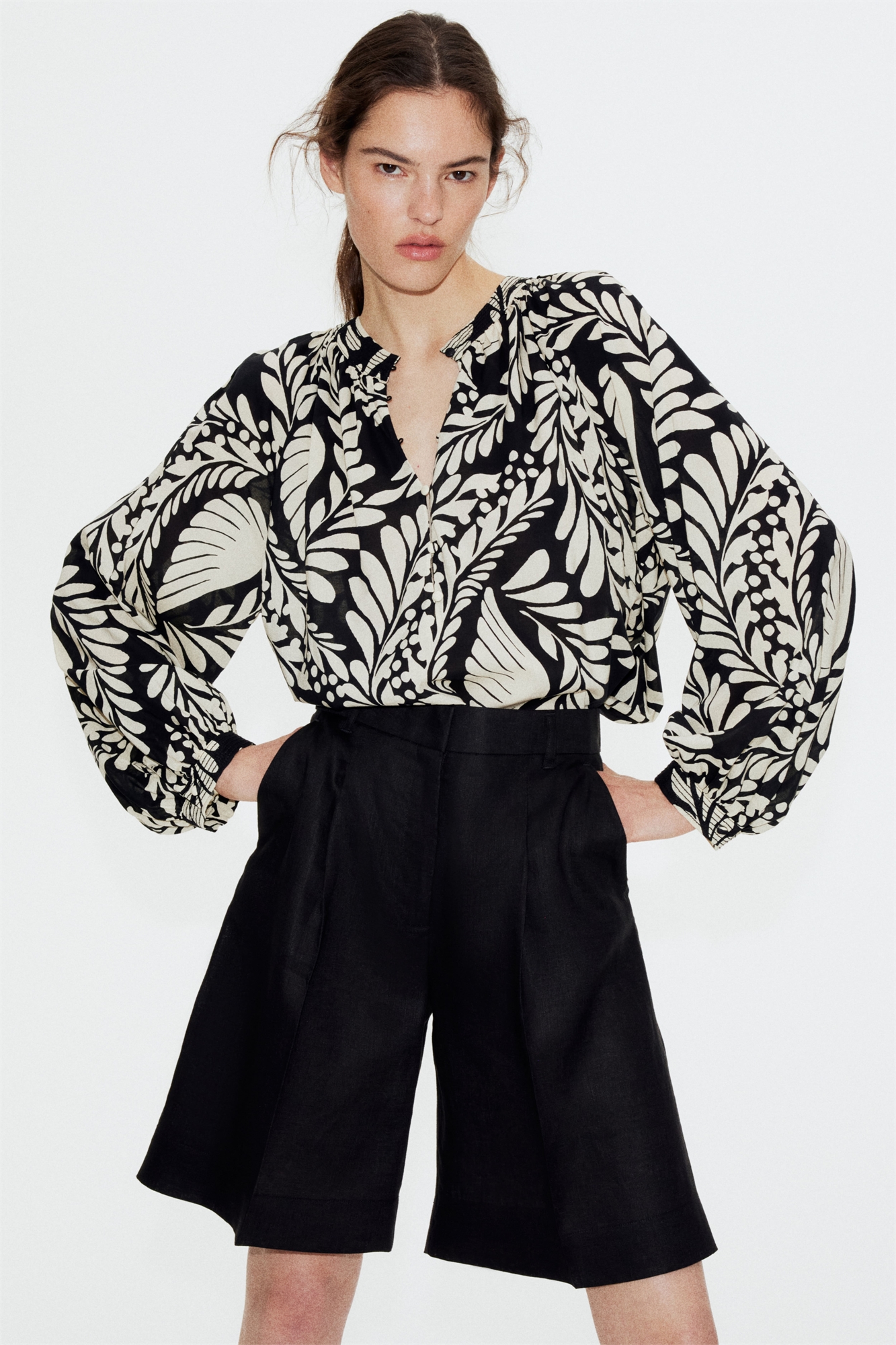 Блузка оверсайз из хлопка и вискозы с воротником-бантом и застежкой на пуговицы спереди. Длинные рукава реглан с узкими манжетами на пуговицах. Аккуратный закругленный подол.