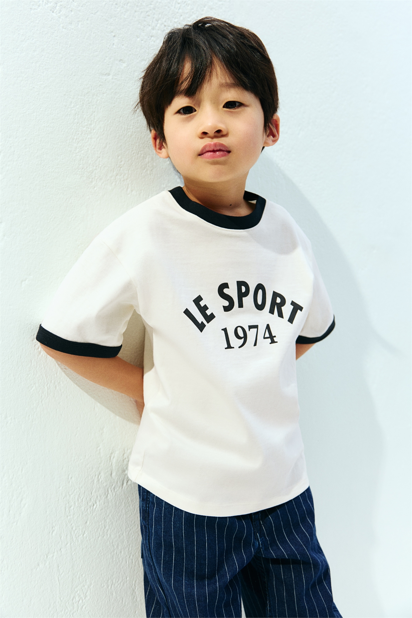 Футболка из мягкого хлопкового джерси с принтом спереди. Круглый вырез, спущенные плечи и отделка контрастного цвета.