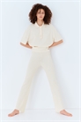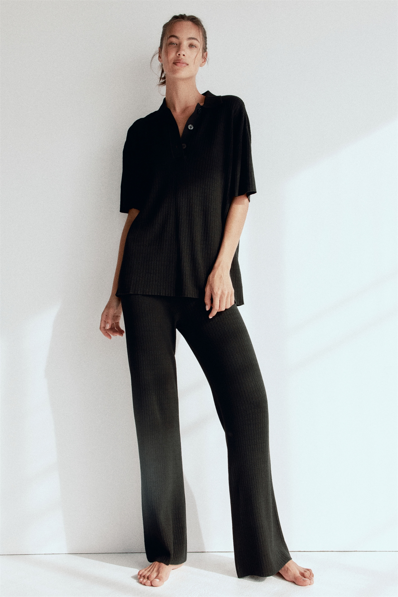 Облегающие брюки из ребристого трикотажа пуантель из смеси вискозы. Эластичная резинка на талии и прямые ноги с легким расклешением к подолу.