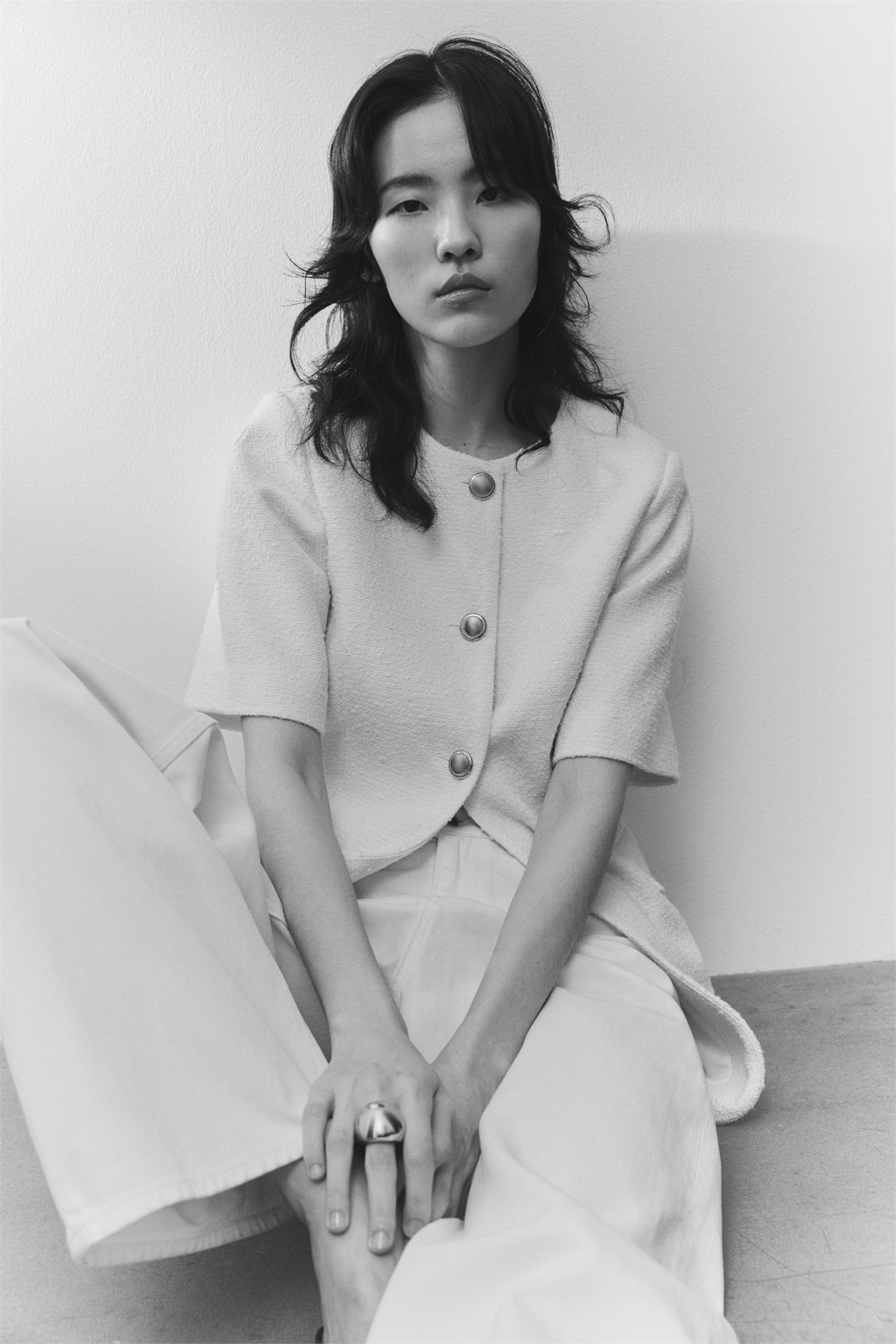 Длинный приталенный блейзер из ткани букле с круглым вырезом и пуговицами спереди. Плечевые накладки, короткие рукава и втачные передние карманы с клапаном. На подкладке.