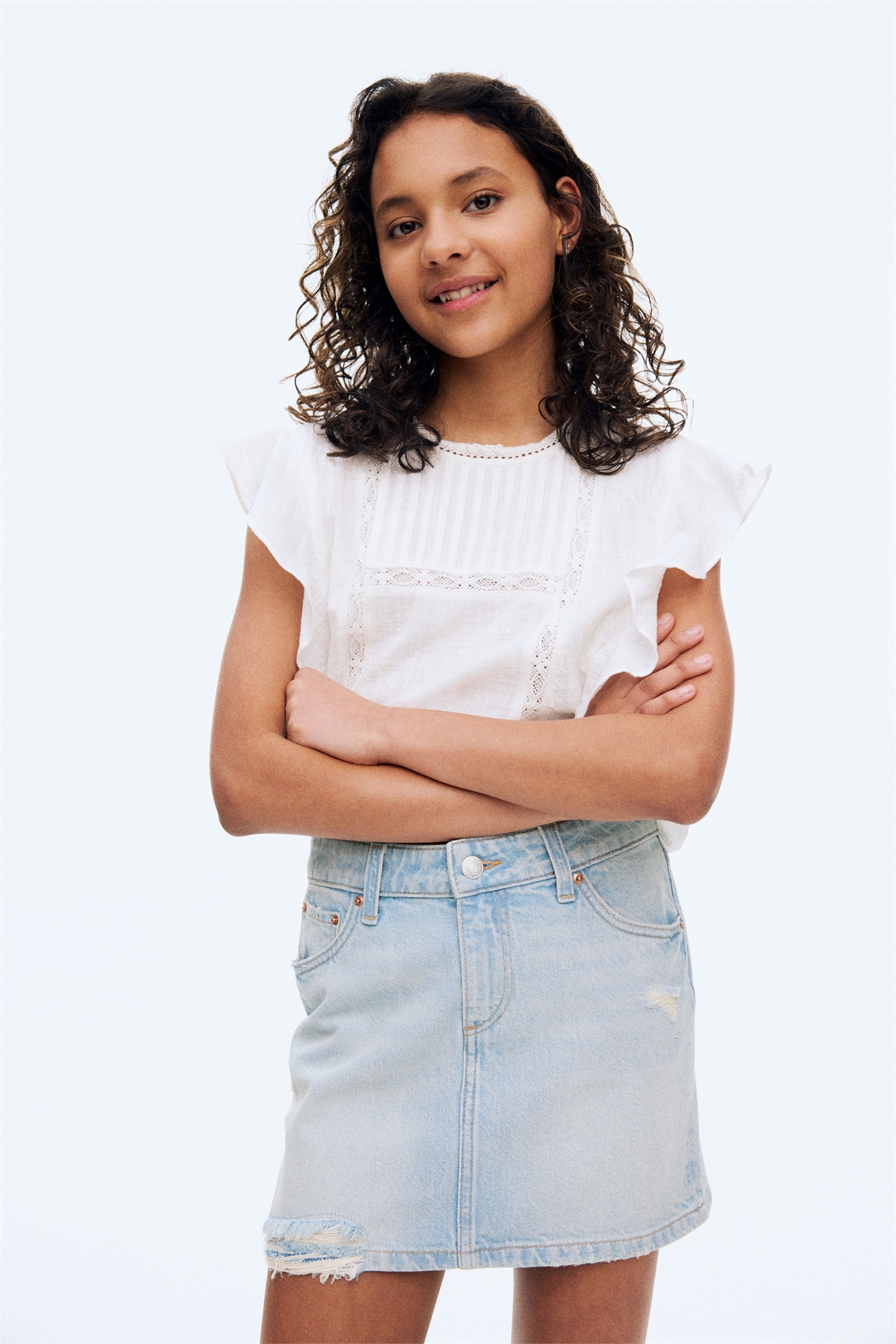 Юбка с 5 карманами из хлопкового денима с поношенными деталями. Регулируемый, эластичный пояс и ширинка на молнии с пуговицей.