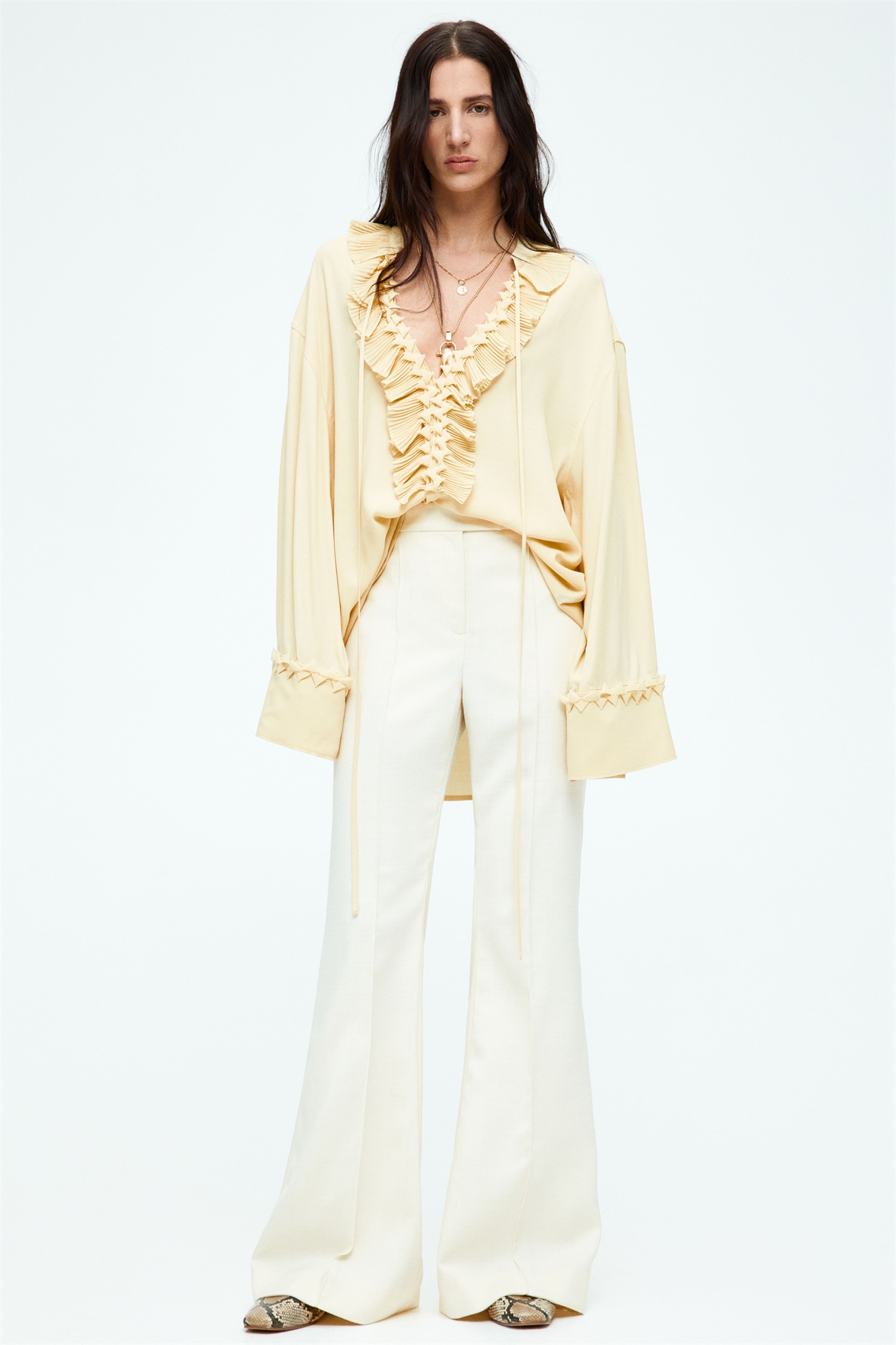 Брюки из тканого материала с заниженной талией, ширинкой на молнии и удлиненным поясом с одной потайной и одной видимой пуговицей. Небрежные боковые карманы, втачные задние карманы и расклешенные удлиненные ноги с застроченными складками спереди и приталенными складками сзади. Приталенный дизайн включает дополнительные припуски на швы на поясе для удобства корректировки.