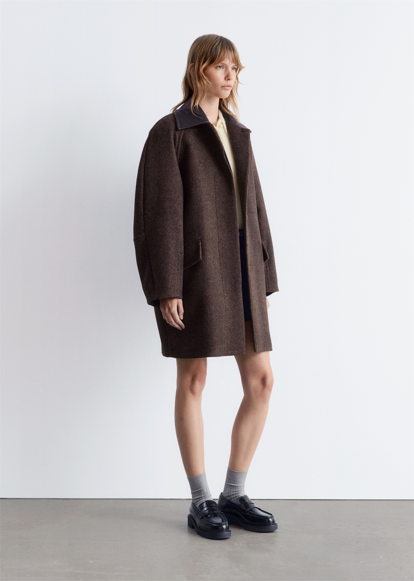 Это пальто сшито из шерстяной смеси и украшено контрастным кожаным воротником. Пальто имеет приталенный силуэт, ниспадающий до середины длины, рукава реглан в форме кокона с подплечниками, потайную застежку с одной видимой верхней пуговицей и косые карманы с клапанами. Полностью на подкладке 71% шерсти RWS TE-00047206 Длина пальто: 91 см / 35,8" (размер S)