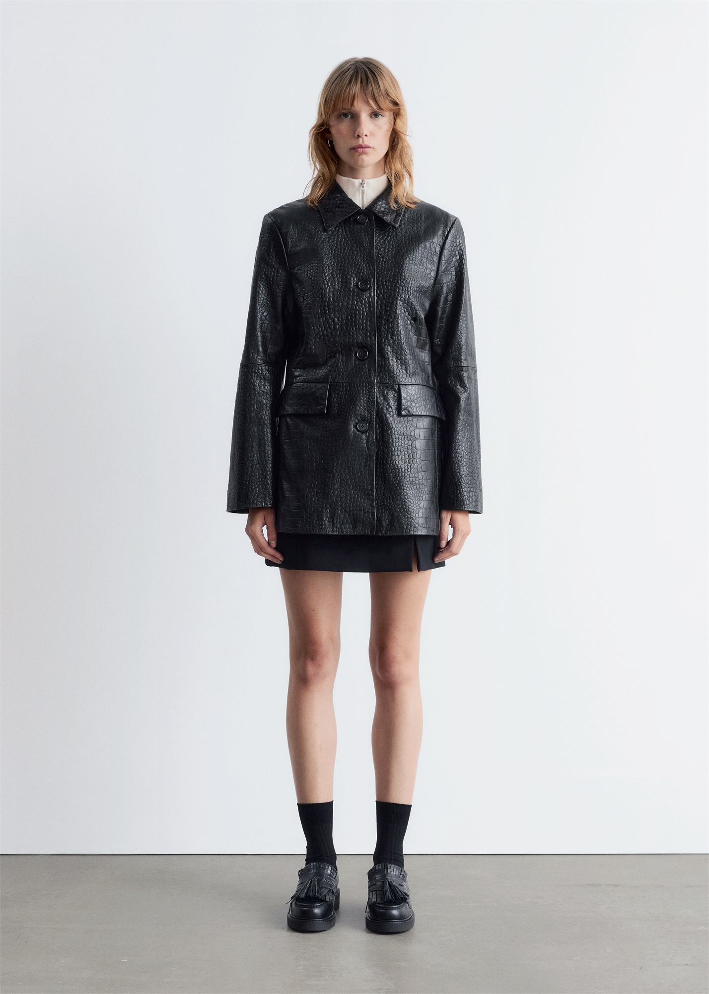 Кожаная куртка с воротником, застежкой на пуговицы спереди, накладными карманами, внутренним карманом и рукавами, слегка расклешенными от локтя вниз. Слегка подбитые плечи придают силуэту стройность. Покрой Regular fit Полностью на подкладке Длина пиджака: 73 см / 28,7” (EU 38 / UK 10 / US 6)