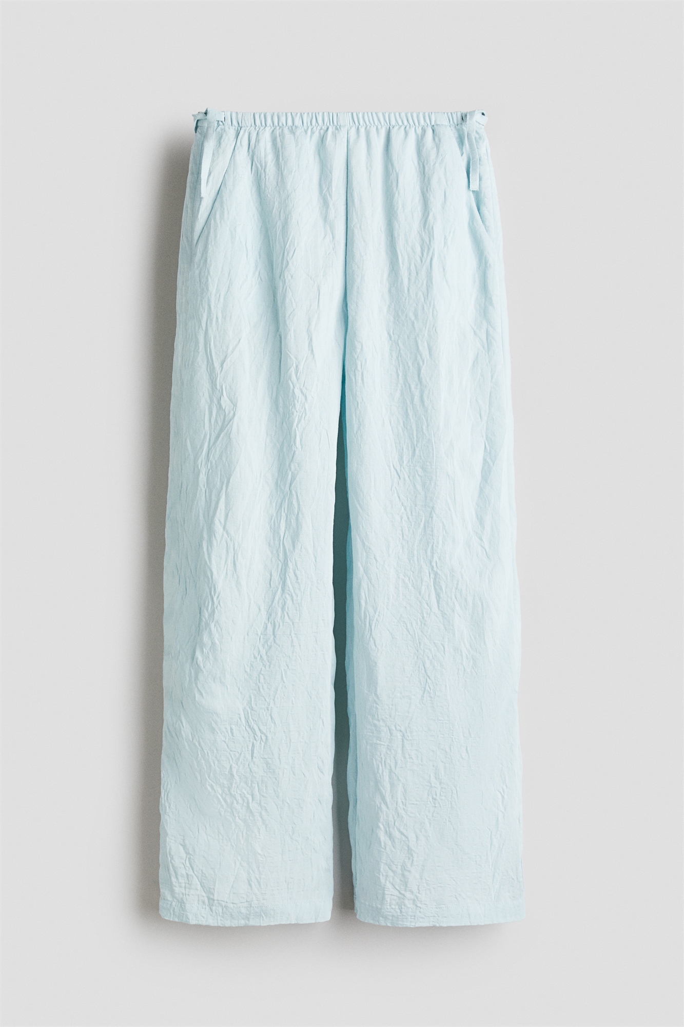 Брюки из воздушного, ворсистого переплетения из смеси вискозы. Эластичная талия с декоративными завязками по бокам, диагональные передние карманы и прямые ноги.