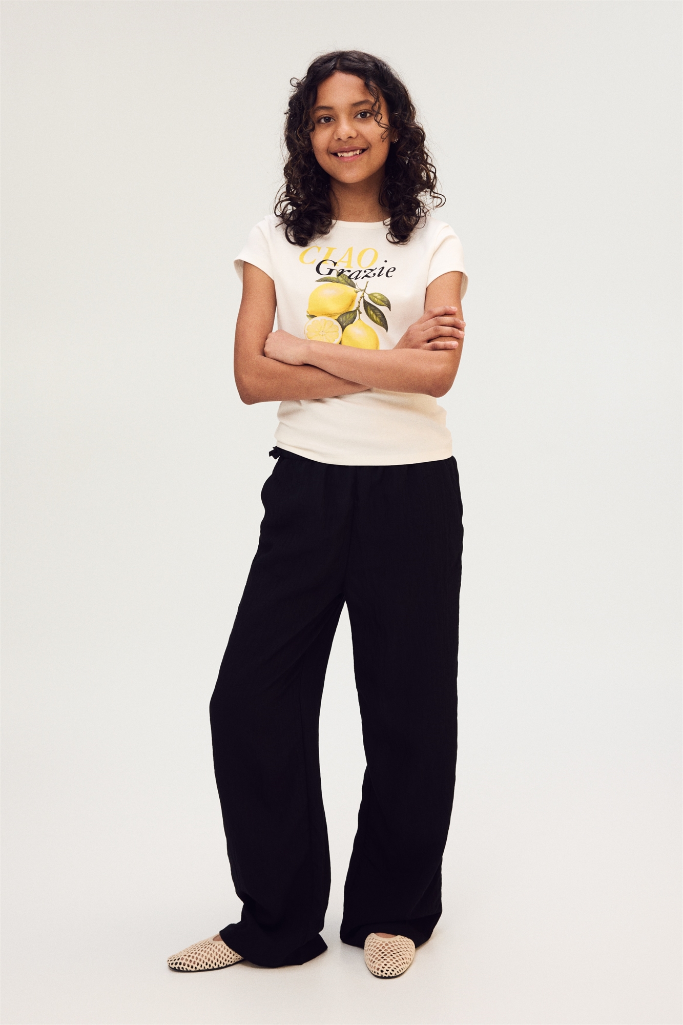 Брюки из воздушного, ворсистого переплетения из смеси вискозы. Эластичная талия с декоративными завязками по бокам, диагональные передние карманы и прямые ноги.