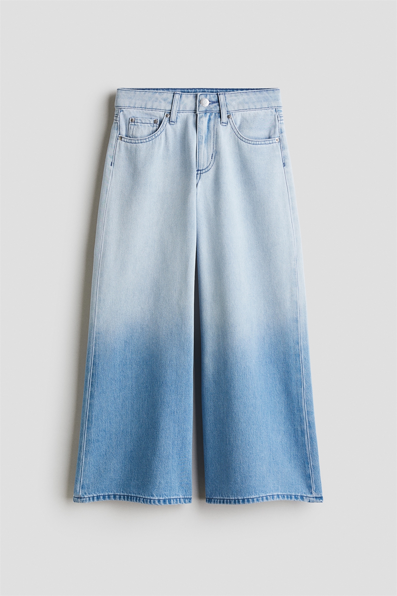 Джинсы с 5 карманами из мягкого денима со свободной посадкой по бедрам и ляжкам и очень широкими штанинами. Заниженная талия, ширинка на молнии с пуговицей и регулируемый эластичный пояс.