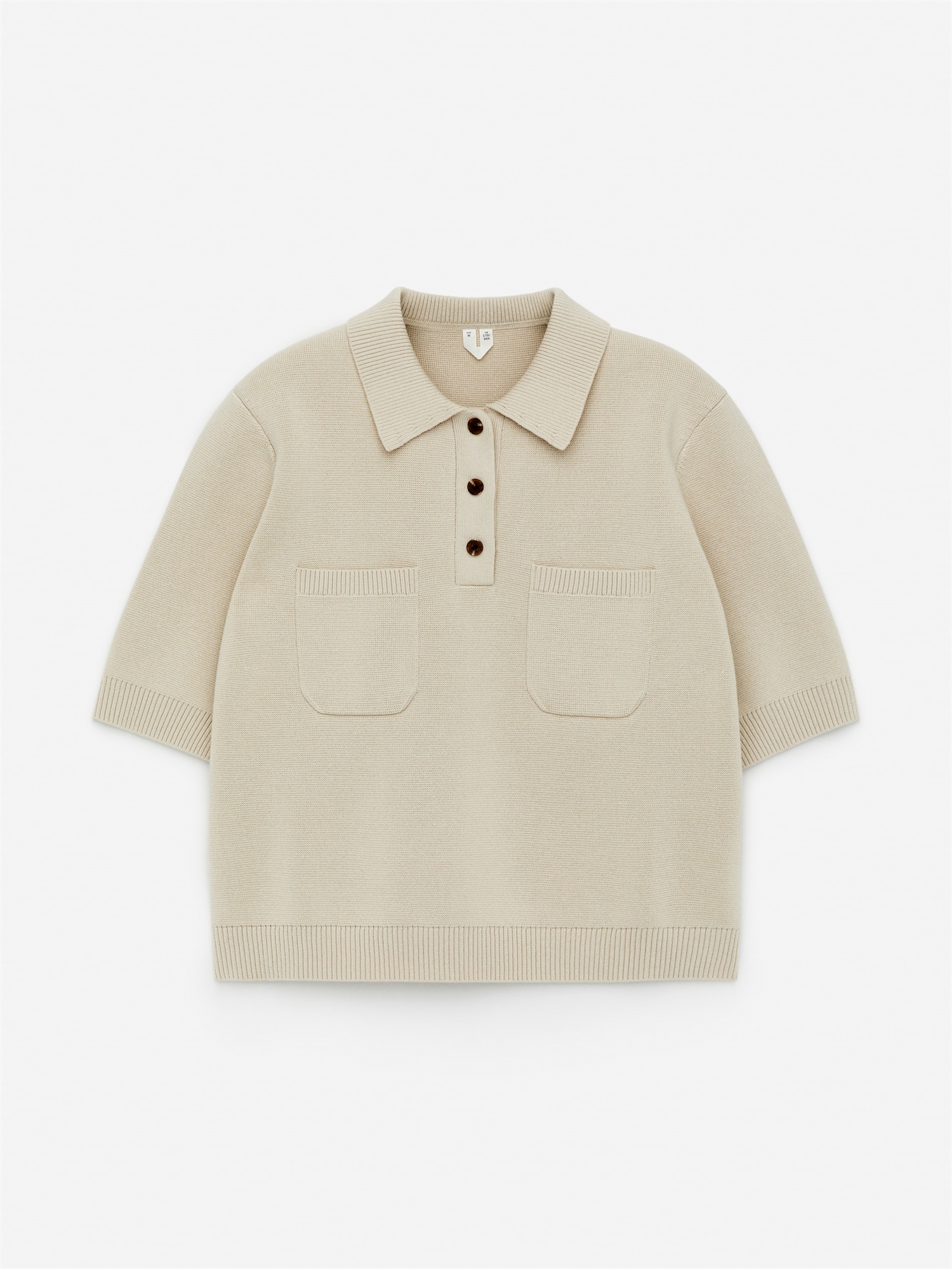 Трикотажный топ с короткими рукавами из хлопка. Воротник, застежка на три пуговицы и нагрудный карман. Обычный крой.