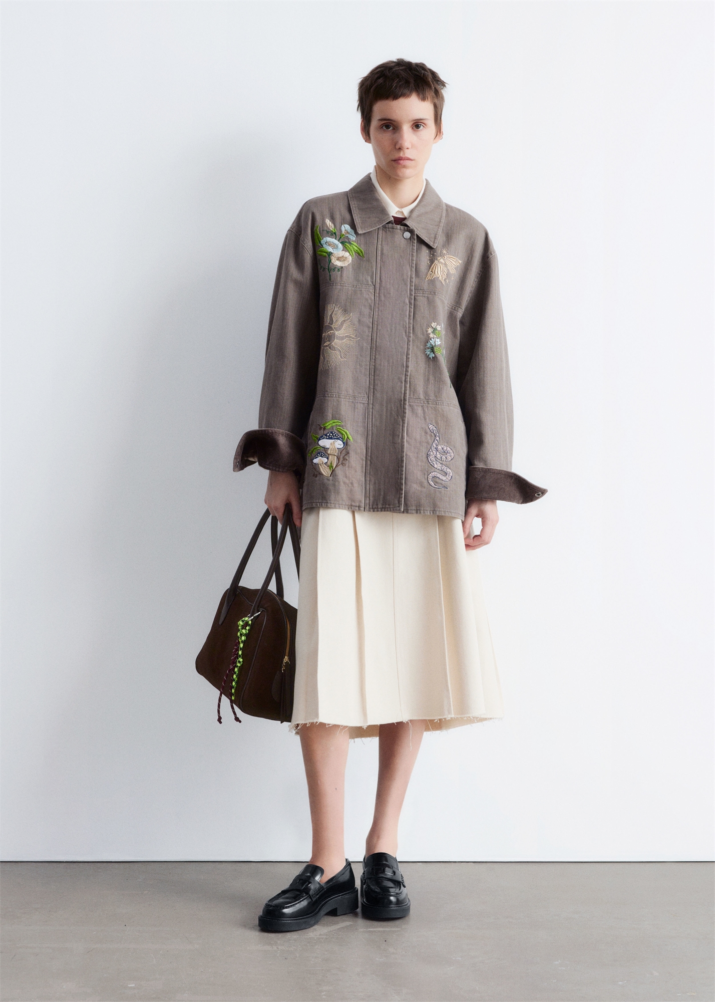 Этот жакет-рубашка из 100% чистого хлопка украшен замысловатой вышивкой. Свободный крой с деталями швов по линии разреза и широкой передней планкой с потайной молнией и скрытыми кнопками-защелками. Слегка удлиненный подол сзади дополнен боковыми разрезами и контрастной подкладкой в клетку. Модель дополнена диагональными втачными карманами. Длина куртки: 77,7 см / 30,6" (размер S)