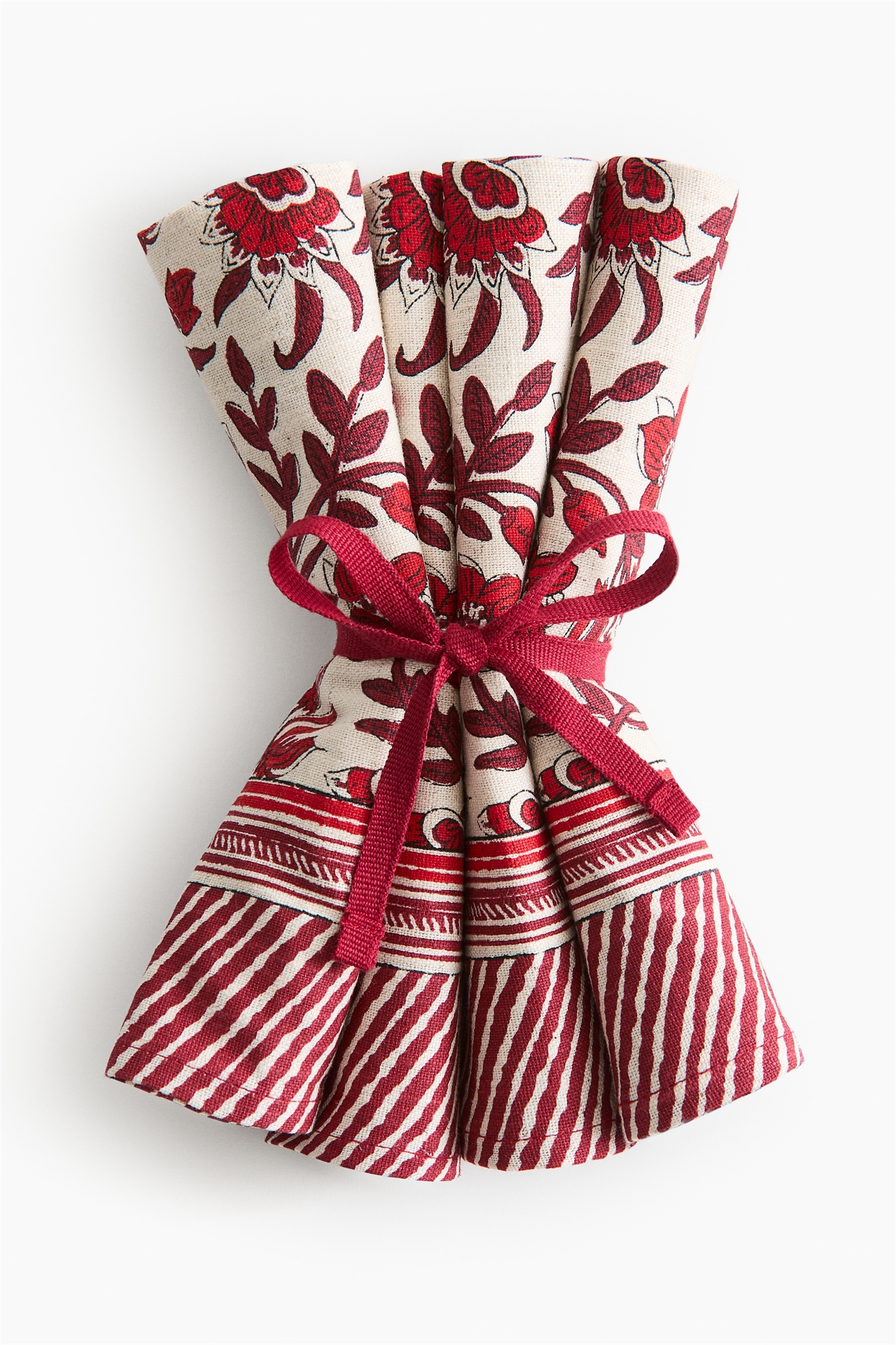В упаковке четыре салфетки из хлопка и льна с красивым цветочным узором. Поставляется с хлопковой лентой, позволяющей сворачивать салфетки и аккуратно хранить их, когда они не используются.