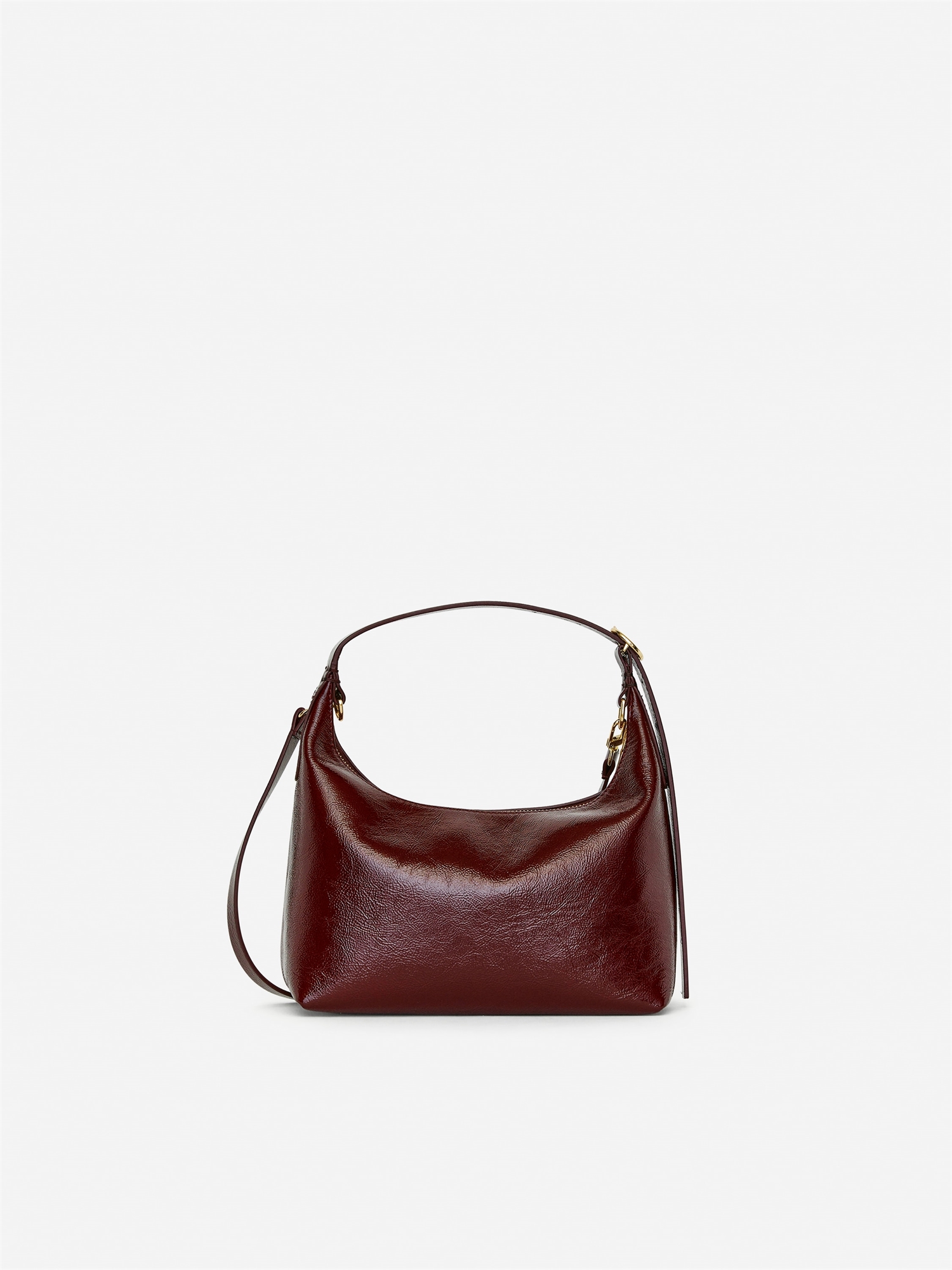 Коробчатая кожаная сумка с регулируемой верхней ручкой и пряжкой золотистого цвета. В комплект входит тонкий плечевой ремень. Внутренний карман на молнии и застежка-молния. Ширина 23 см, высота до середины 16 см, высота до начала ремешка 19 см, глубина 10,5 см.