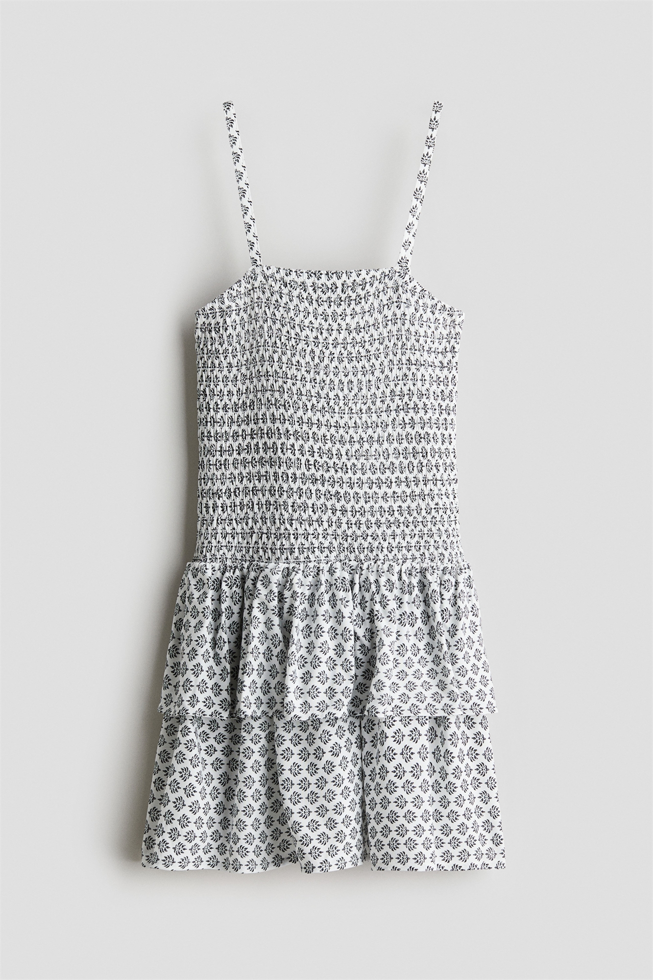 Платье из мягкого, воздушного материала с лифом, украшенным платочной вязкой. Узкие регулируемые бретели, квадратный вырез, сборчатый шов ниже талии и юбка с воланами.