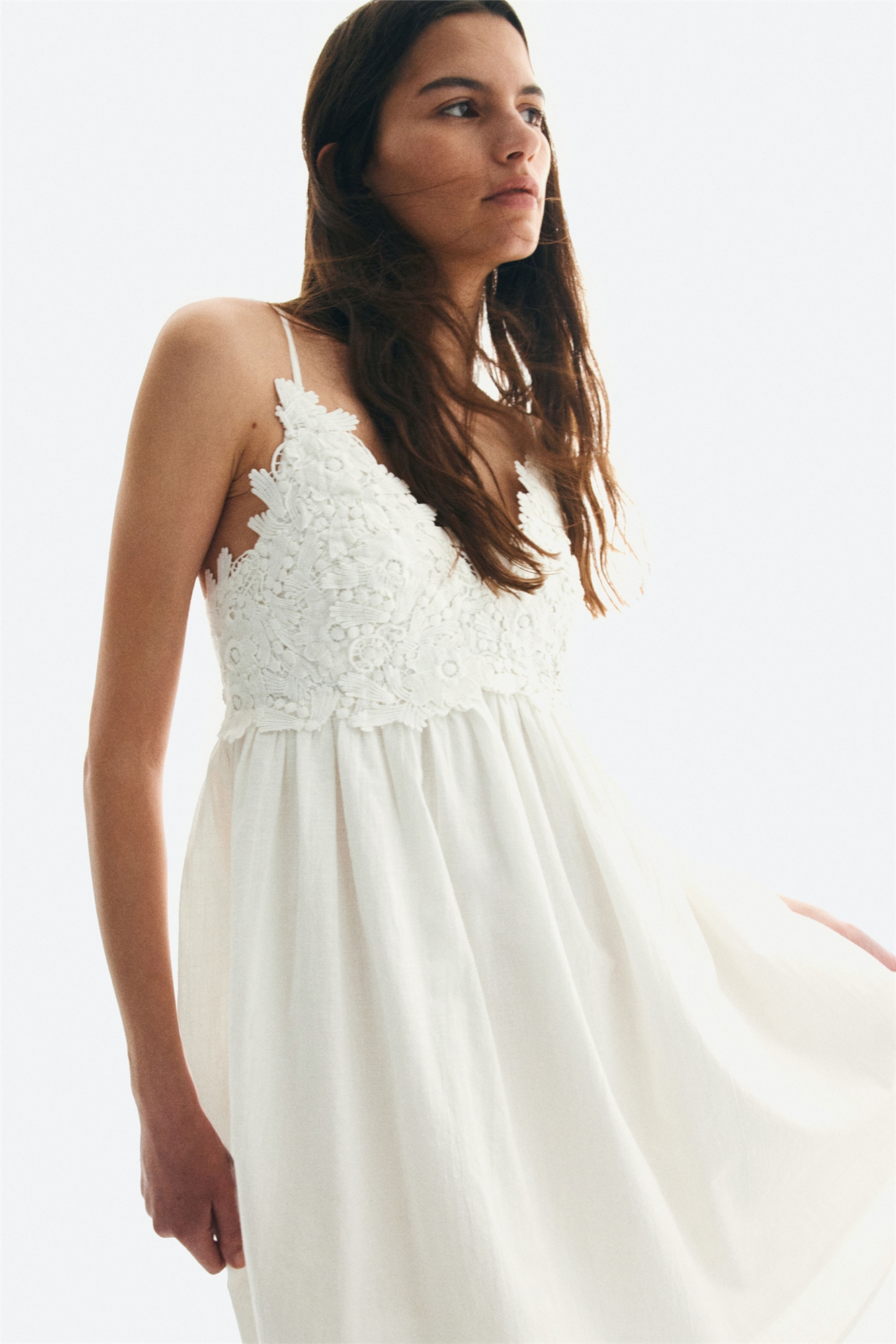 Короткое платье из хлопкового полотна с регулируемыми бретелями-спагетти и приталенным лифом с декоративной вышивкой на бюсте и эластичным швом сзади. Присборенный шов на талии и расклешенная юбка. Частично на подкладке.