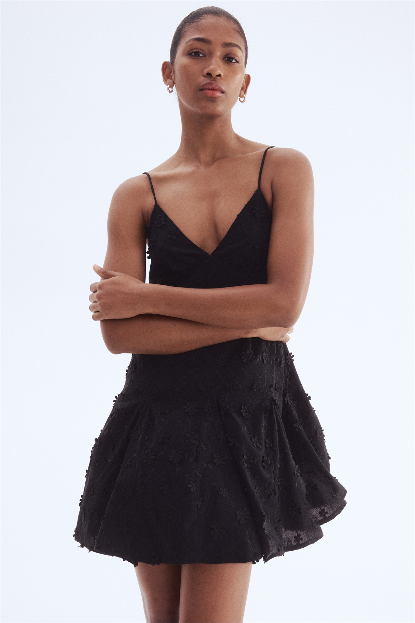 Короткое платье А-линии из воздушного хлопкового полотна, украшенное вышивкой тон в тон и цветочными аппликациями. V-образный вырез горловины, спинка в форме совочка и бретели-спагетти, которые продеваются через маленькие петельки и завязываются сзади. Сборчатый шов под бюстом, узкая резинка сзади и расклешенная юбка со складками годе для придания дополнительного объема. На подкладке.