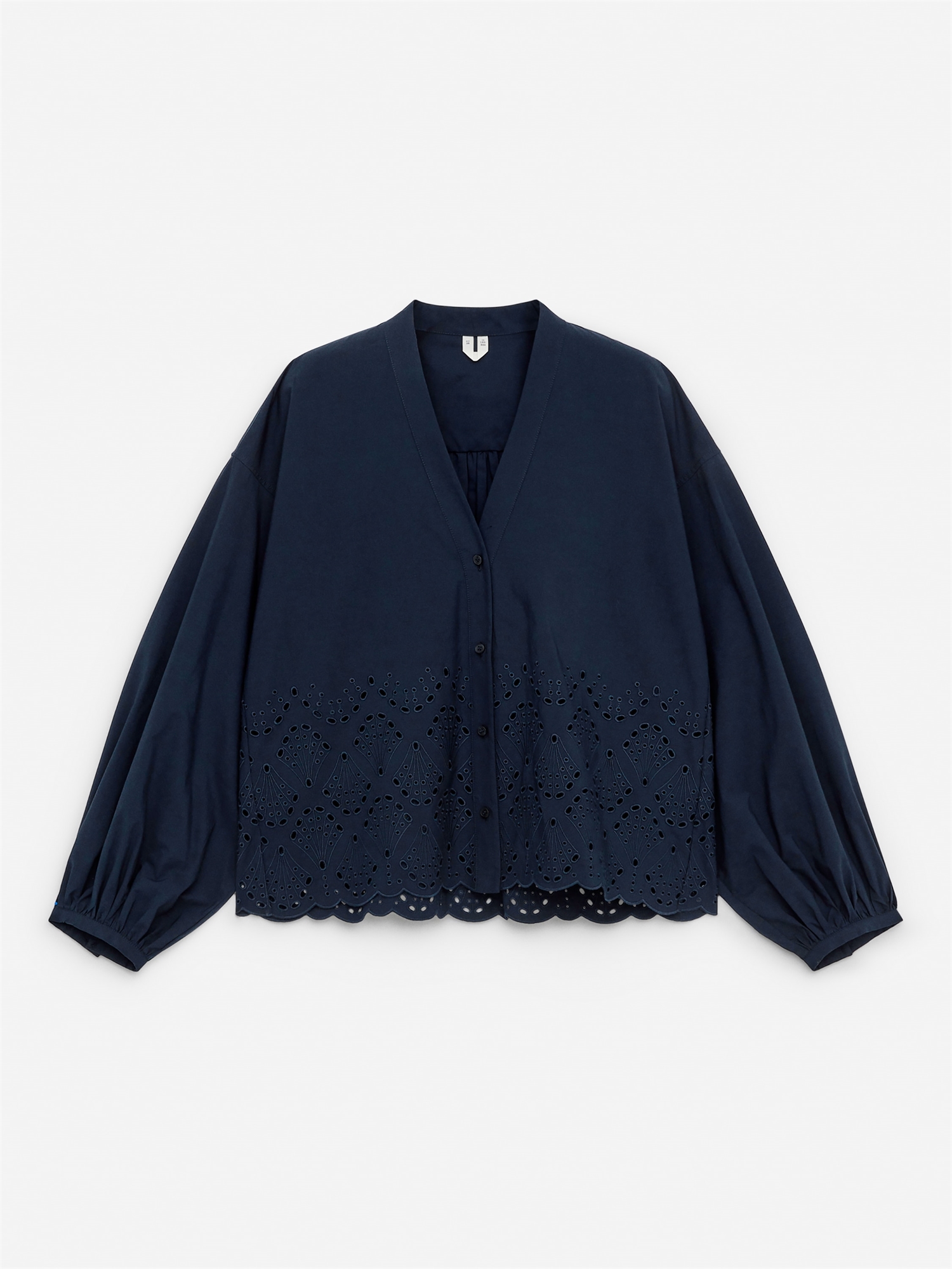Хлопковая блузка с деталями в стиле broderie anglaise и слегка пышными рукавами. По подолу и на концах рукавов обработаны кромки babylock. Обычный крой.