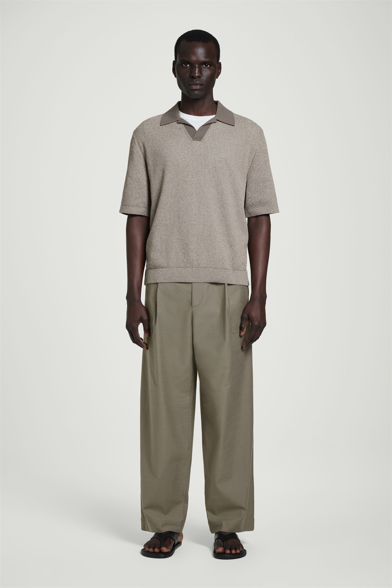 Эти современные брюки с широкими штанинами - основа гардероба в стиле smart-casual. Они выполнены из хлопкового твила с едва заметным эффектом стрейча и имеют приталенный пояс, втачные карманы и острые складки, придающие формальность. Наденьте их с льняной рубашкой. Свободный кройЗастежка на крючок, планку и молнию Материал: 97% хлопок, 3% эластан. Без учета отделки / Машинная стирка Внутренняя длина ноги размера EU 48 составляет 75 см / Модель носит размер EU 48