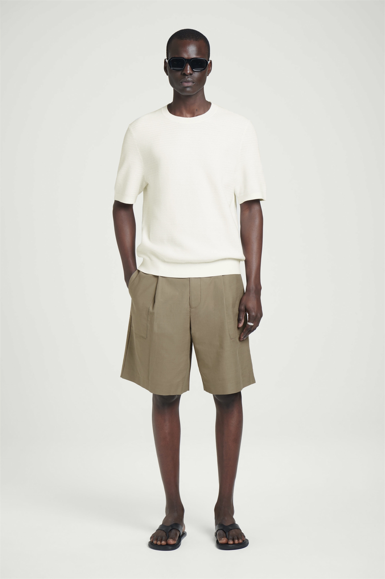 Эти полированные шорты-чинос подходят для повседневного стиля. Они сшиты из хрустящего хлопка и эластичной ткани, имеют притачной пояс, прорезные карманы и складки спереди. Подойдите к льняной рубашке. Свободный кройЗастежка на крючок, планку и молнию Материал: 97% хлопок, 3% эластан. Без учета отделки / Машинная стирка Внутренняя длина штанины размера EU 48 составляет 21,75 см / Модель носит размер EU 48