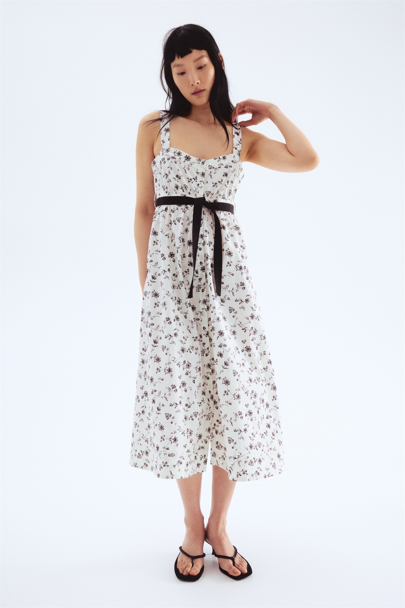 Платье длиной до колена из хлопкового поплина с вырезом в форме сердца, застежкой на пуговицы спереди и широкими бретелями. Сборки на талии, завязывающийся пояс контрастного цвета и расклешенная юбка. Без подкладки.