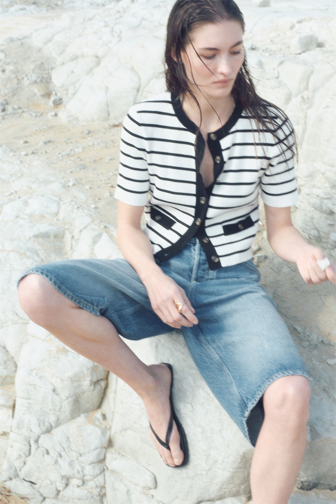 Короткий приталенный кардиган из мягкого трикотажа в рубчик с круглым вырезом и пуговицами спереди. Короткие рукава и втачные карманы с пуговицей.