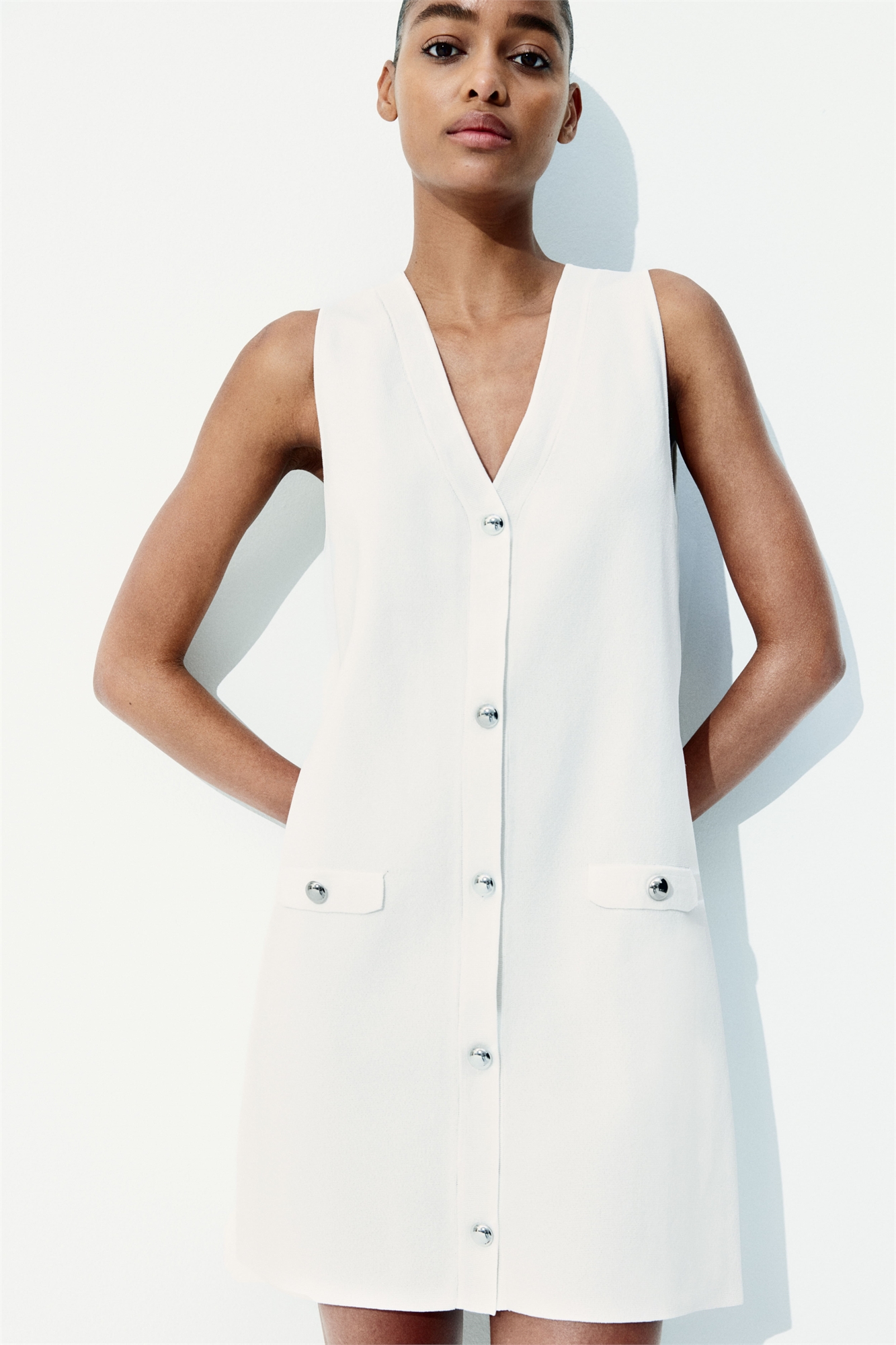 Короткое приталенное платье из плотного трикотажа с глубоким V-образным вырезом и металлическими пуговицами спереди. Без рукавов, с декоративными карманами на пуговицах спереди.