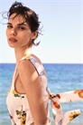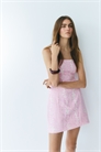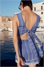Короткое приталенное платье из тканого материала с широкими бретелями и квадратным вырезом. Глубокий V-образный разрез с большим бантом сзади и открытой частью на талии с потайной застежкой-молнией и застежкой-крючком внизу. Подкладка из хлопковой вуали.