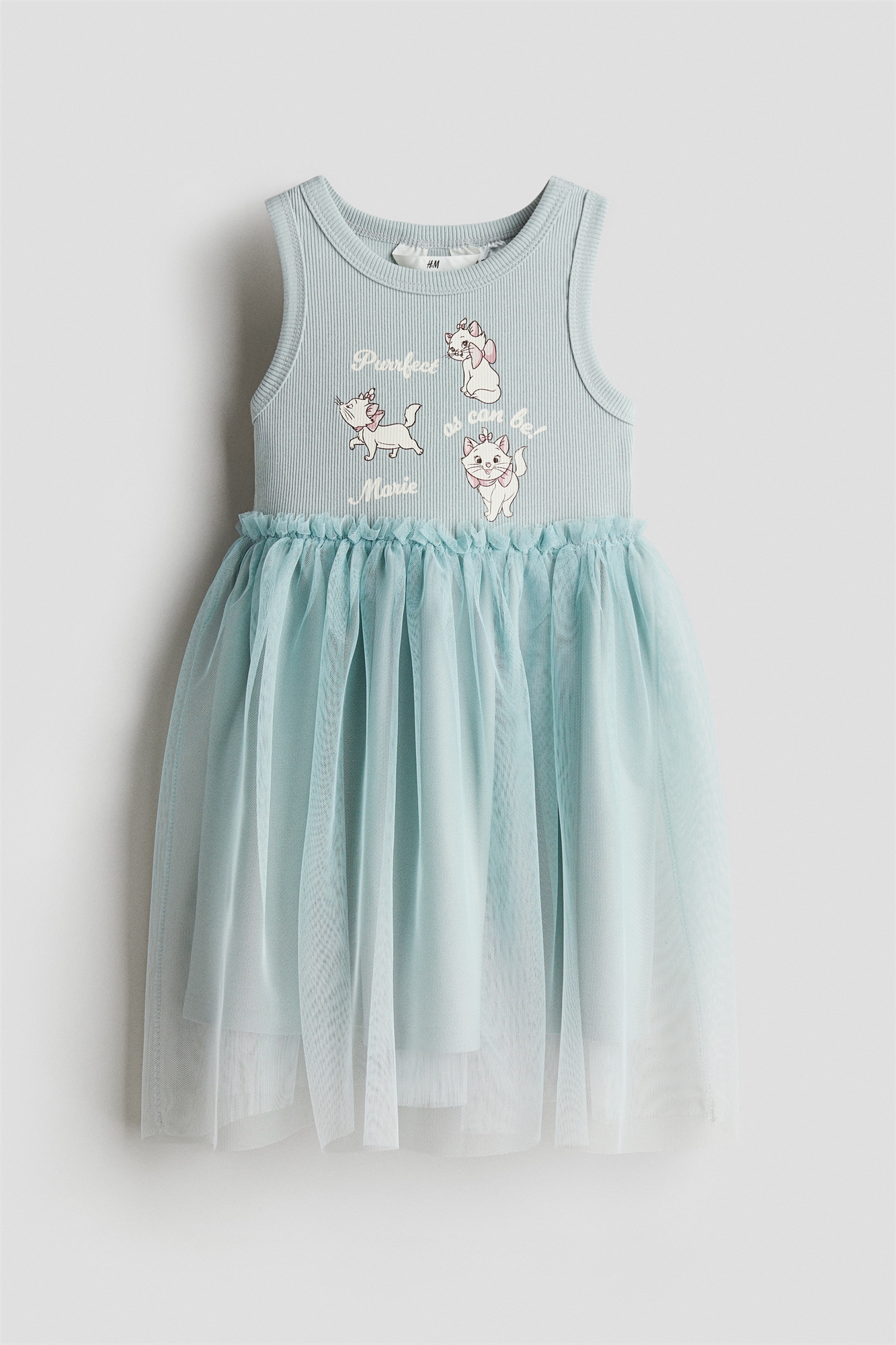 Платье без рукавов из ребристого, мягкого хлопкового джерси с круглым вырезом и принтом спереди. Собранный, отделанный оборками шов на талии и юбка из узорчатого тюля с нижней юбкой из джерси.