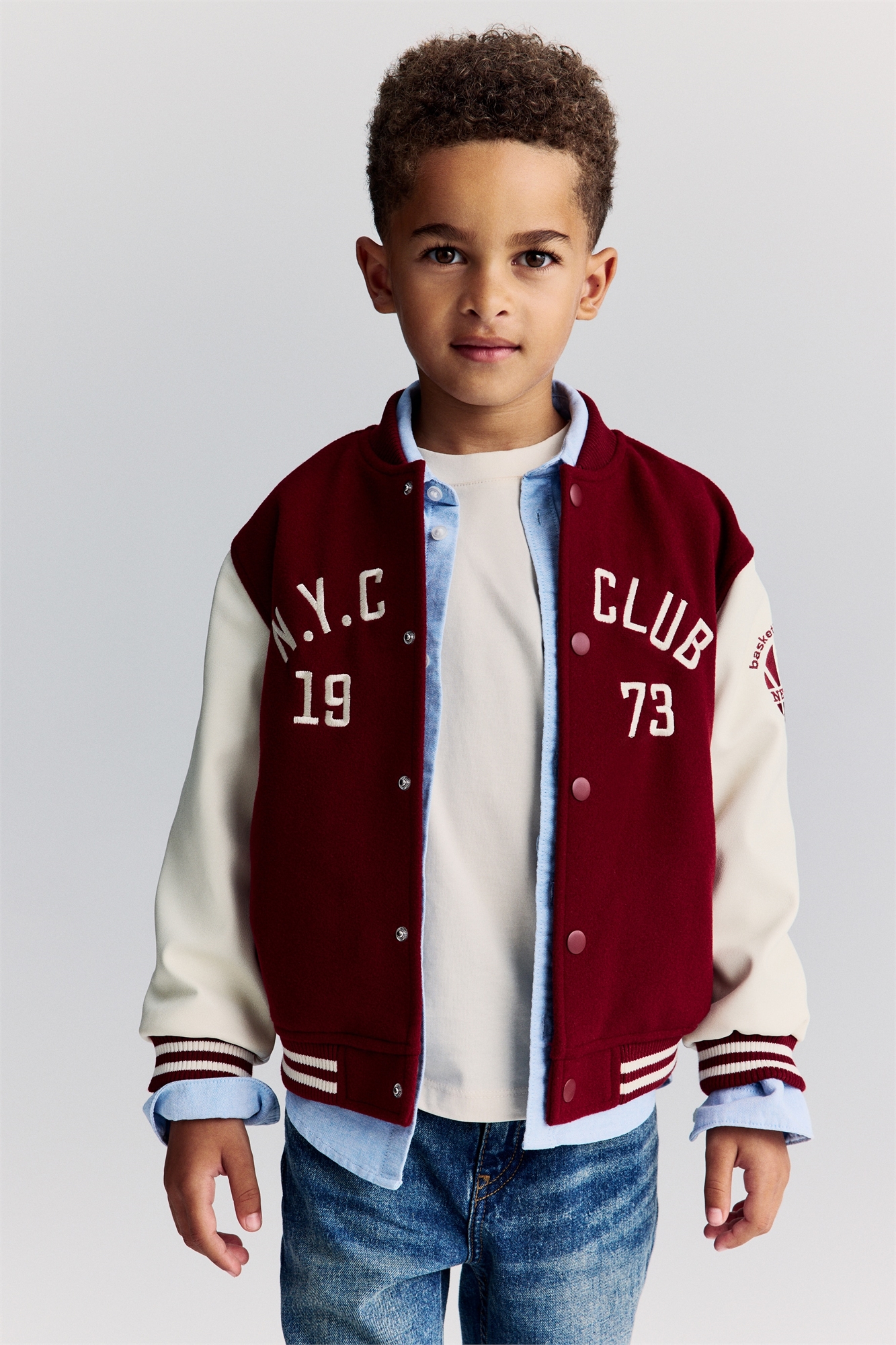 Бейсбольная куртка из войлока с деталями из мотивов и рукавами реглан контрастного цвета. Ребристый воротник, застежки на кнопки спереди и прорезные передние карманы. Широкая ребристая отделка на манжетах и подоле. На подкладке.