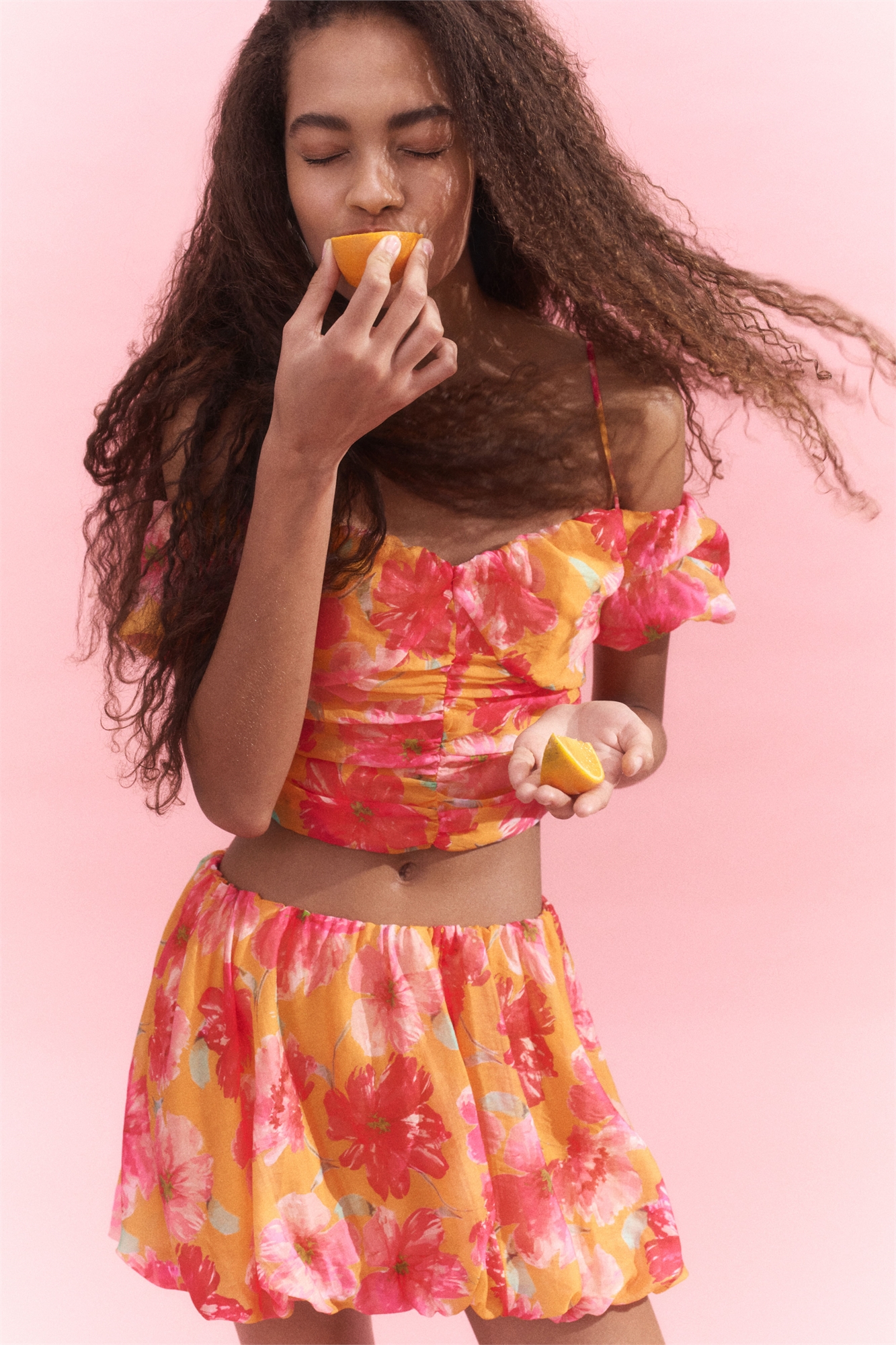 Приталенная блузка из воздушного крепа с вырезом в форме сердца, узкими регулируемыми бретелями и короткими рукавами с эластичной резинкой. Спереди и сзади потайной шов и потайная застежка-молния с одной стороны. На подкладке.